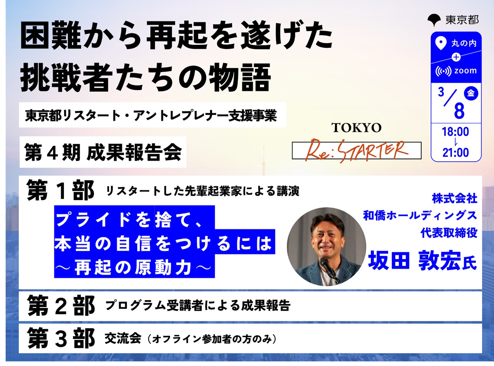 【東京都主催】困難に直面した起業家たちの再起をかけた情熱を体感。1年間の再挑戦プログラムの成果を披露!「TOKYO Re:STARTER」成果報告会、2024年3月8日(金)開催決定。
