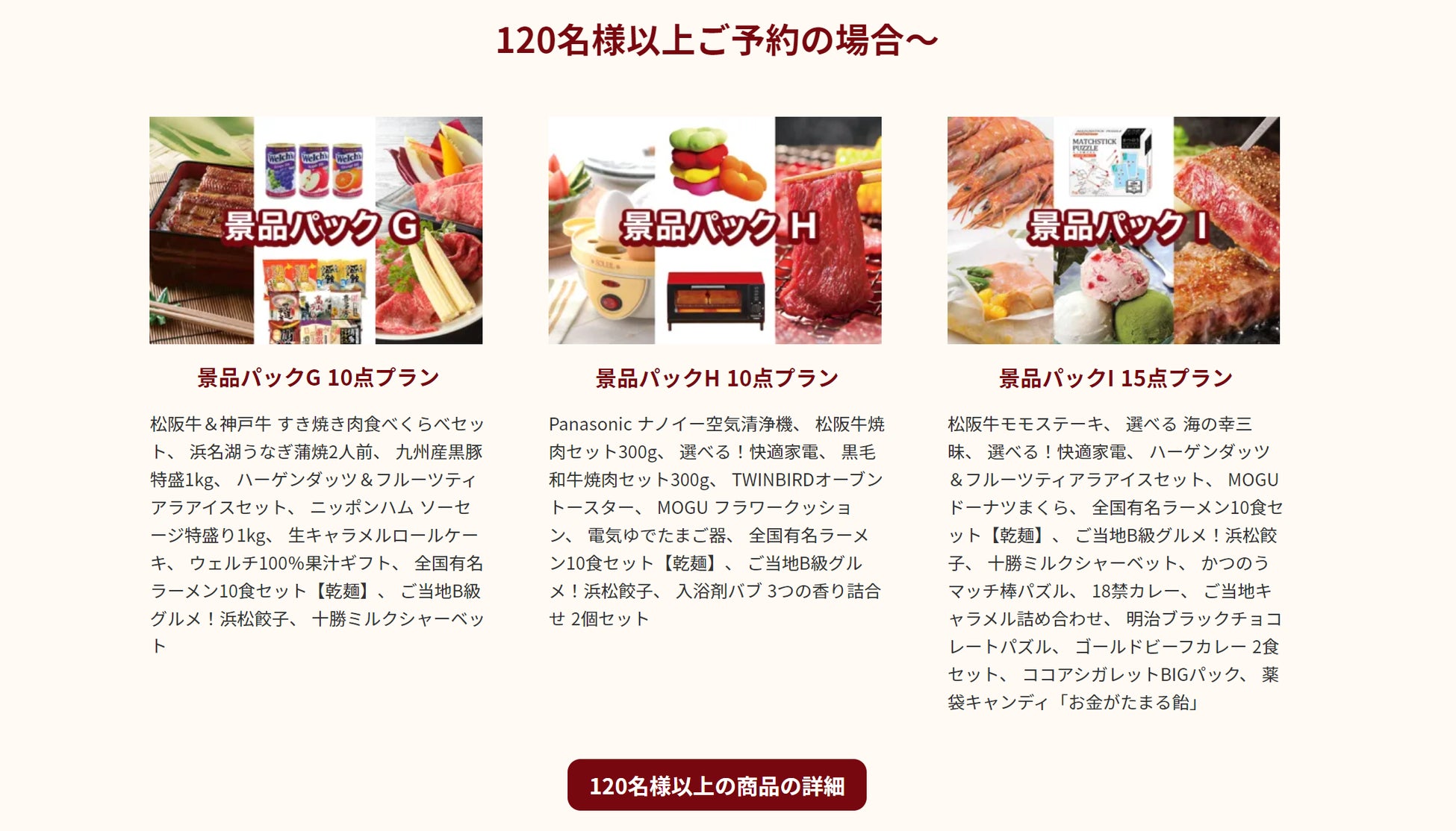 - 120名様以上ご予約の場合 5万円相当の景品パック(景品:10~15点)