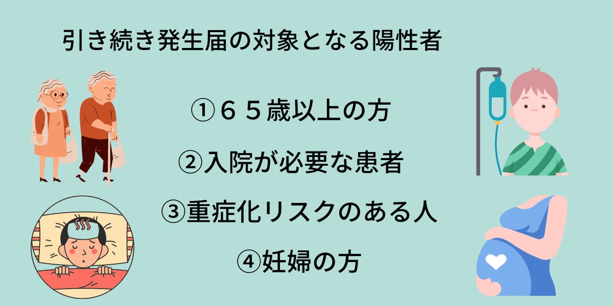 今までは陽性者全員の発生届を提出させていただいていましたが、今後の発生届の対象者は①65歳以上②入院が必要な患者③重症化リスクのある人④妊婦のみとなります。それ以外の陽性者の方は、各都道府県が開設している陽性者登録センターへ自ら申請する必要があります。Setolabo衛生検査所は、2020年の開設時より、全国で初めて衛生検査所として、提携医療機関を通してや独自ルートで、陽性者全員の発生届を提出してきました。しかし、国の方針に併せて対象者を絞って発生届を出すことになりますので、ご利用者様におかれましても、ご理解のほどよろしくお願い申し上げます。