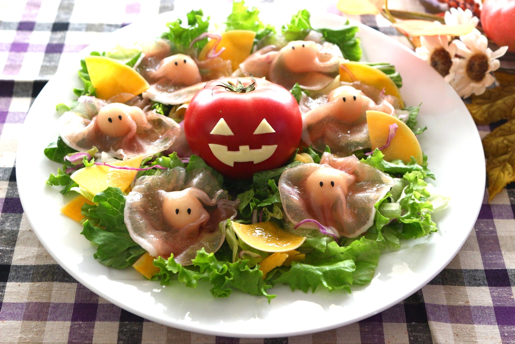 中身のモッツァレラチーズがほんのり透けて見える生ハムおばけが真っ赤トマトのジャックオランタンを取り囲む、可愛いハロウィンサラダです。