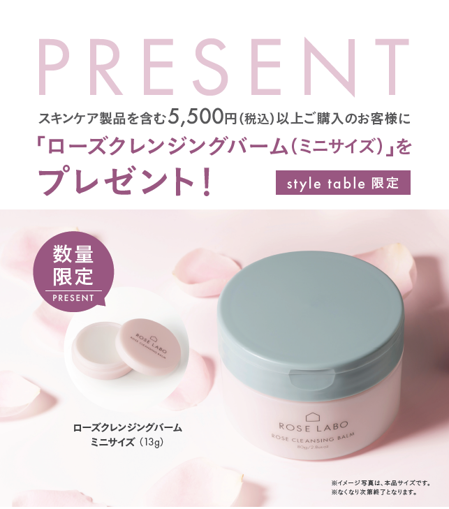 キャンペーン期間中各店舗で、スキンケア商品を含む5,500円(税込)以上お買い上げの方に、ROSE LABO 「ローズクレンジングバーム」のミニサイズ1個をプレゼントいたします。