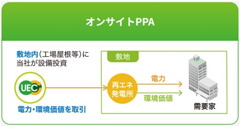※1「太陽光発電コーポレートPPAサービス」とは、第三者が需要家の敷地や屋根などを借用して太陽光発電システムを設置し、発電した電力を長期にわたり需要家に販売するモデルです。設置場所が電力消費場所と同じ場合はオンサイト型、異なる場合はオフサイト型と呼ばれます。需要家は初期投資ゼロで再生可能エネルギー由来の電力を活用でき、加えて電気料金の削減が期待できます。