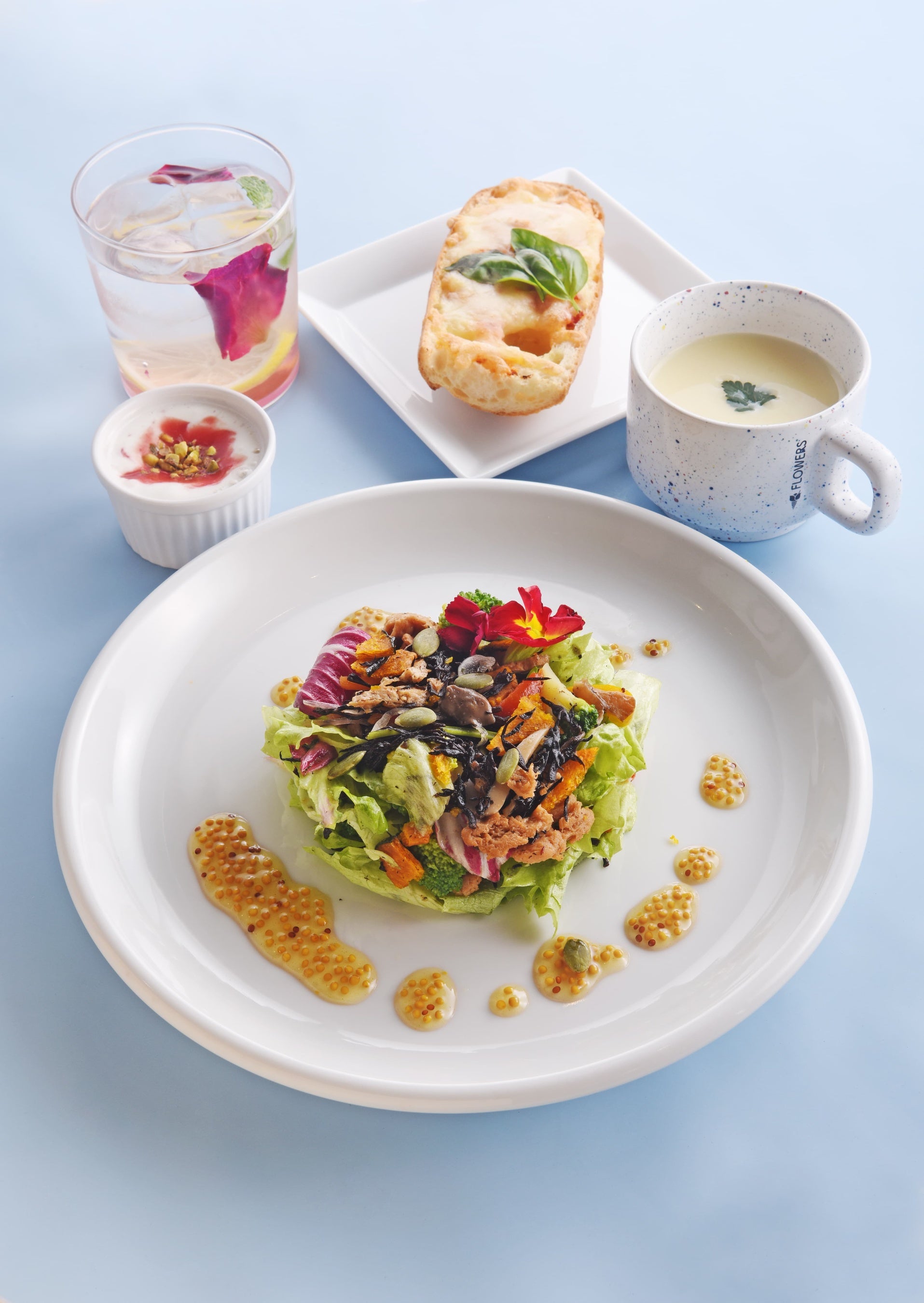 立川の複合施設GREEN SPRINGSにて、花と食を軸に、あらゆる角度で花の楽しみ方を提案するブランド「FLOWERS」はこれまでの店舗テーマの「花を食べ楽しむ」に加え、新たに「プラントベースで美味しくヘルシーに」を設定。