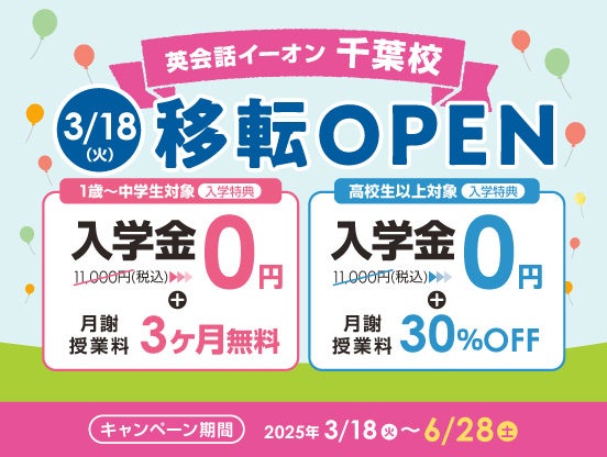 英会話教室を運営する株式会社イーオン(本社:東京都新宿区、代表取締役社長:重野卓、以下「イーオン」)は、2025年3月18日にイーオン千葉校を移転オープンいたします。