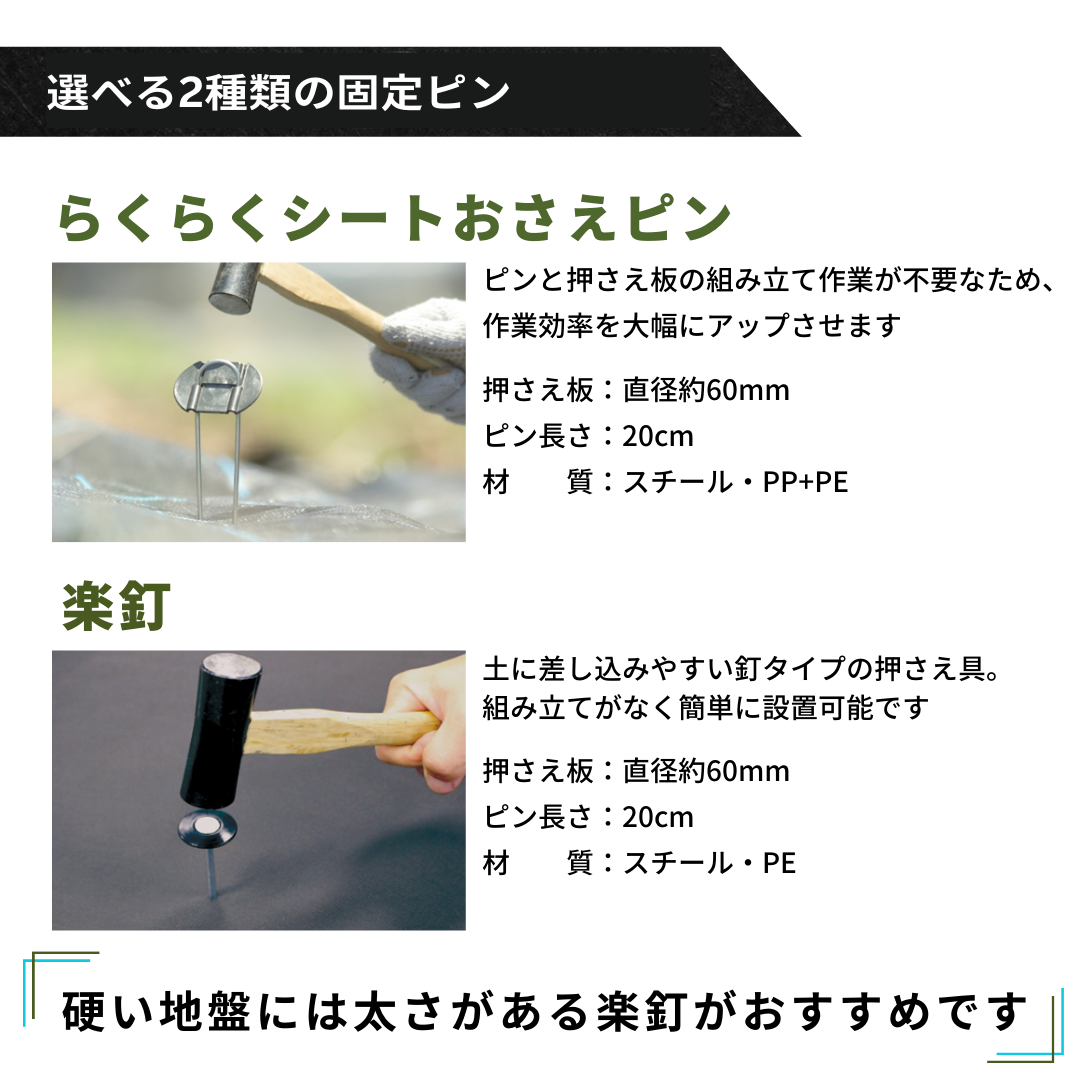 シートと固定ピンがセットになったタイプもあります。ピンと押さえ板の組み立てが不要な「らくらくシートおさえピン」と土に差し込みやすい釘タイプの「楽釘」の2種類です。(ピンなし、シートのみのタイプもあります。)
