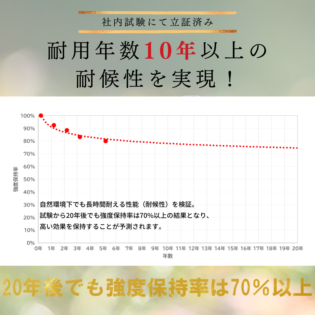 紫外線による劣化を防止するためにUV剤(紫外線吸収剤)を添加しています。さらにカーボンブラックと呼ばれる顔料を原料であるポリプロピレンに加えることで、製品の耐候性をより向上させ、10年の耐用年数を実現しています(社内試験による)。