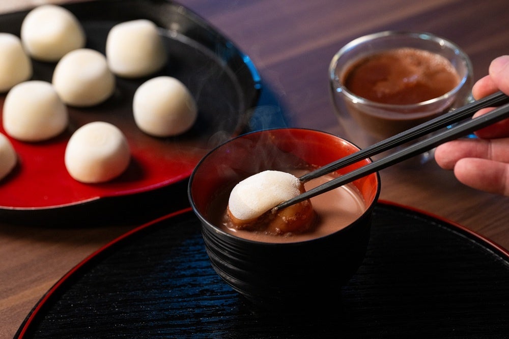 朝食会場レストラン「シャルロッテ」前ロビーで、つきたての温かいお餅と祝い酒もご用意。さらに、ロッテ「ガーナ」を使用したホテルオリジナルのホットチョコレートに「ミニ雪見だいふく」を浮かべた「雪見チョしるこ」もご提供いたします。