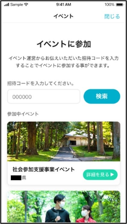 また、招待コードを入力することで、特定コミュニティに参加することができ、お住まいの自治体が主催するイベントや、趣味のサークルなどの案内を随時アプリ内で確認するなど、社会参加の輪を広げることが可能です。