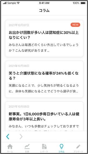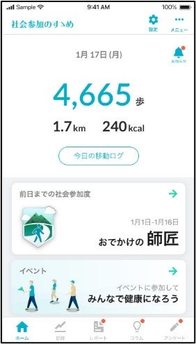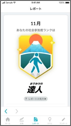 日々の生活の中で、「外出する」「地域や趣味の集まりに参加する」「友人に会う」など、人と交流する行動を総称して「社会参加」と呼びます。この社会参加が活発な人ほど、要介護認定を受けたり、認知症を発症したりする割合が小さくなることが日本老年学的評価研究機構(以下、JAGES機構)の調査で明らかとなっており、健康長寿を実現するためには、運動や食事などのケアに加え、社会参加をすることが重要です。本アプリは、スマートフォンを持ち歩くだけで、利用者の社会参加の度合いを自動で測定し、レポートやグラフなどで確認できるほか、健康長寿の秘訣や社会参加に関する正しい知識を分かりやすく紹介したコラムを配信するなど、利用者は楽しみながら社会参加のきっかけを作ることができます。