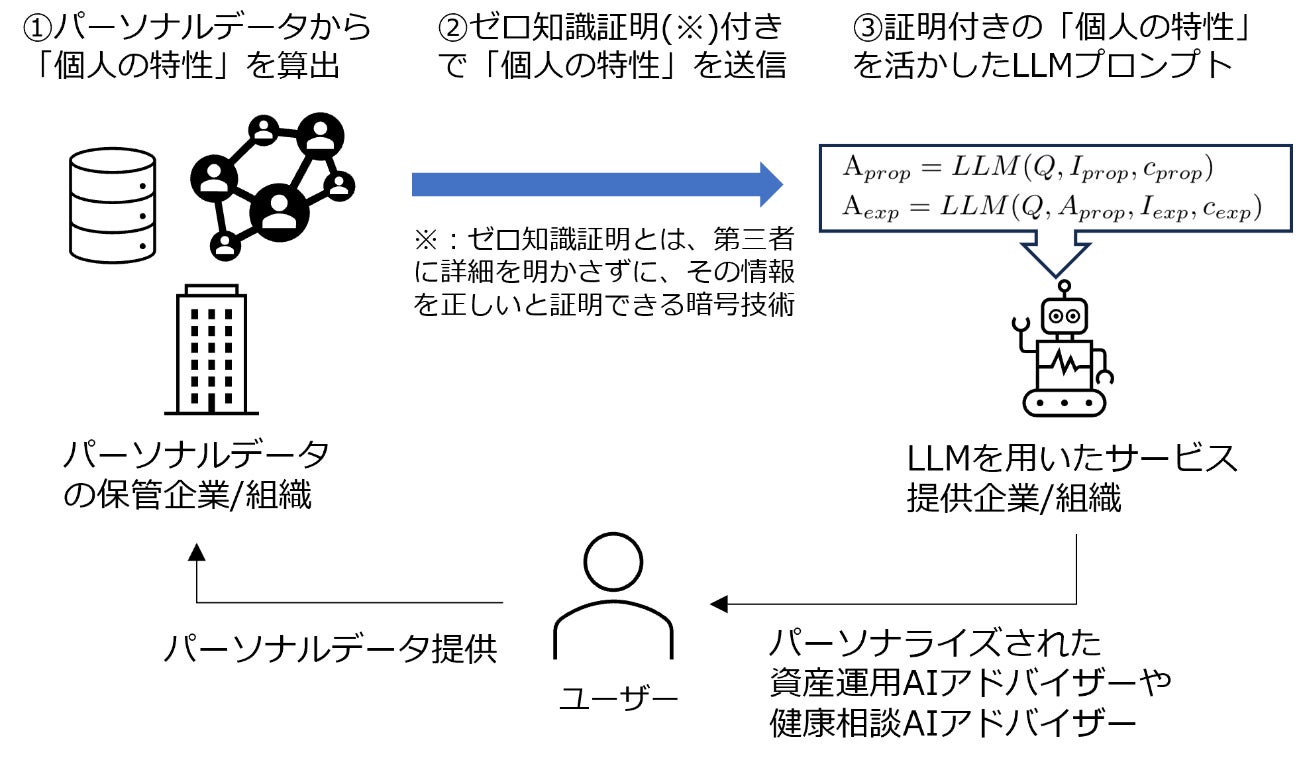 本論文の成果を活用すると、パーソナルデータを保管する組織と、データを活用する(LLMサービスによってアドバイスを提供する)組織が異なる場合でも、パーソナルデータを保護しながら、個人に合わせたLLMサービスを安全に提供することが可能になります。