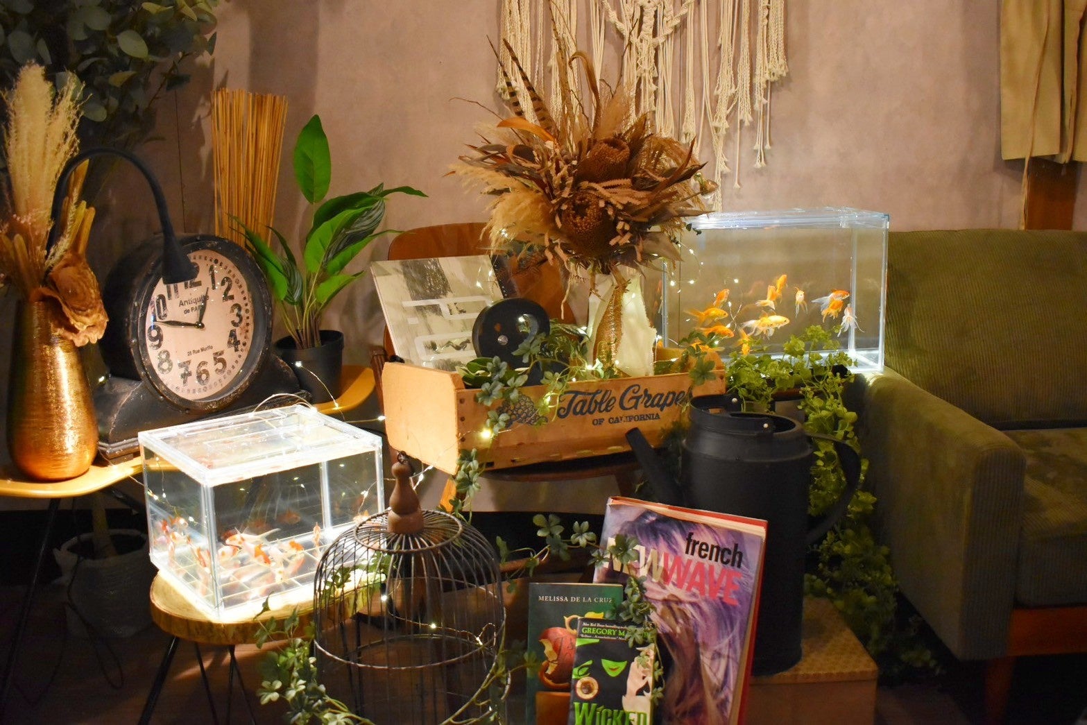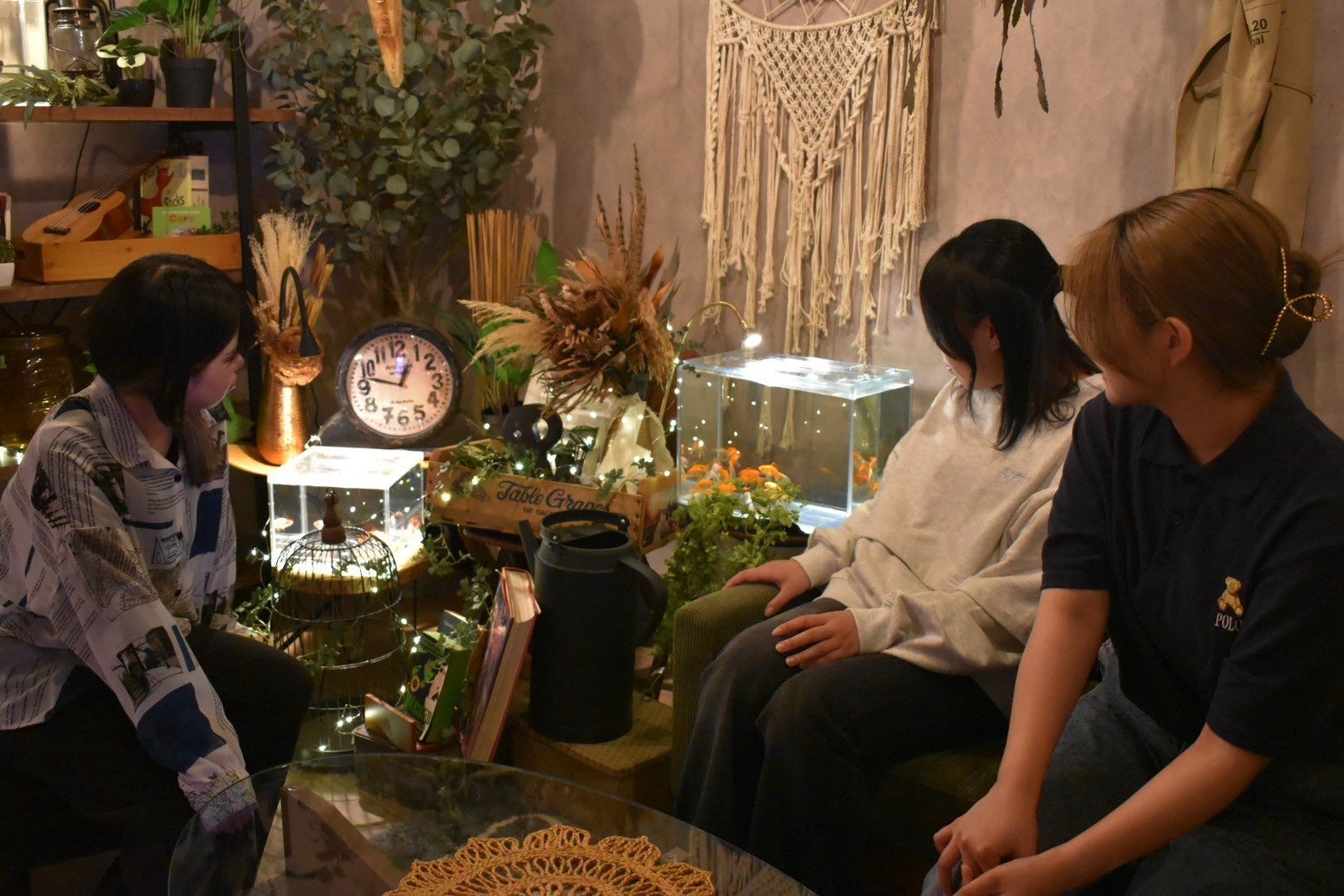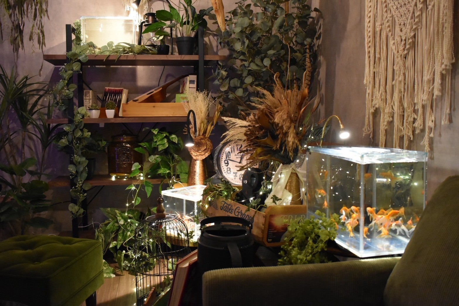 会場には、グリーンインテリアをベースにしたリビング空間が設けられ、水槽が自然と生活に馴染む様子をリアルに再現。