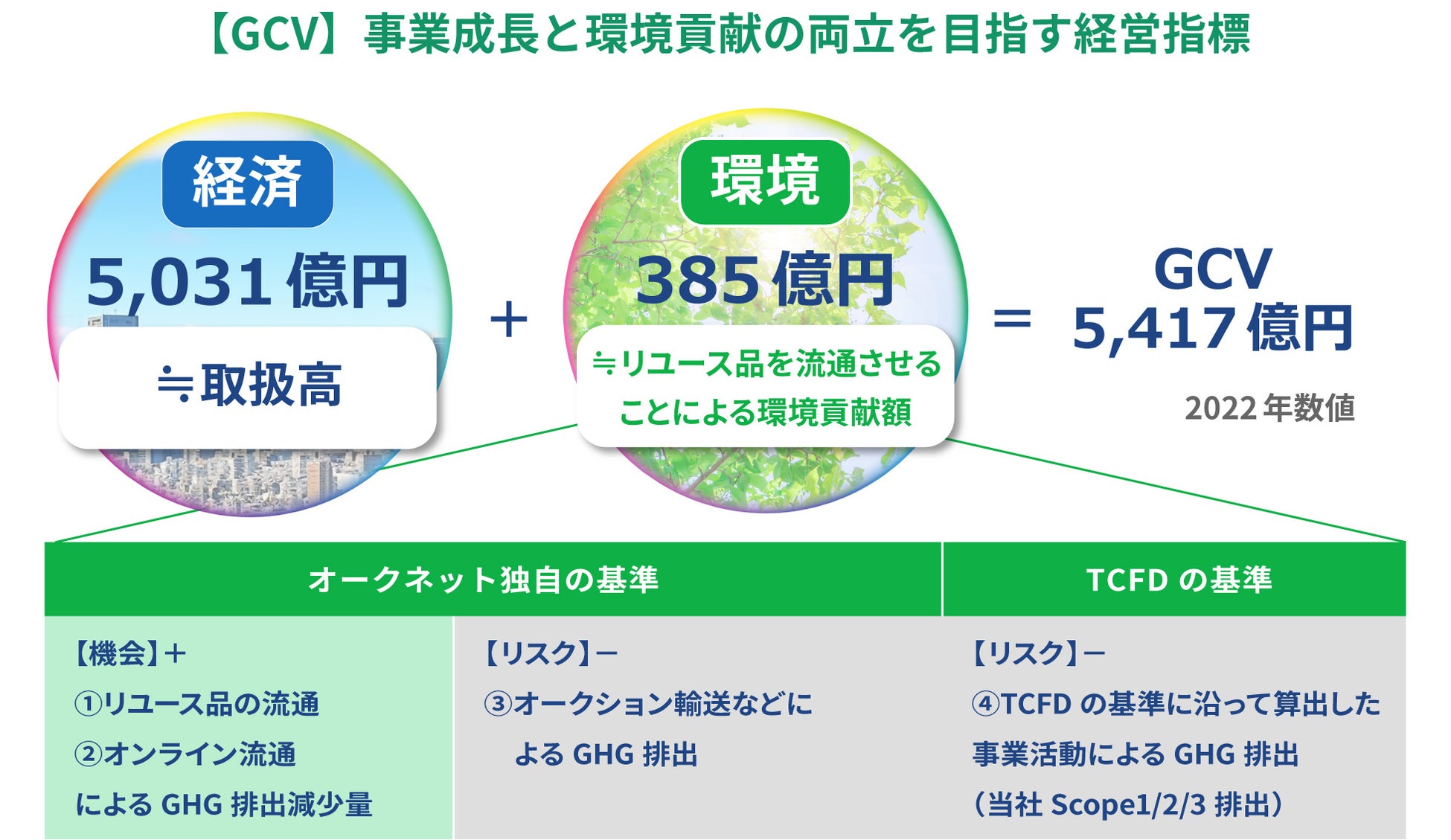 オークネットは、「価値あるモノを、地球規模で循環させる。~Circulation Engine.(サーキュレーションエンジン)」というサステナビリティポリシーのもと、世界中のパートナーとともにさまざまな業域で、あらゆる「価値あるモノ」を「必要な人のもと」へ循環させる循環型流通を構築し、創業当時より持続可能な地域環境の形成に貢献してまいりました。2021年には、オークネットの事業活動により“経済”とリユース品の流通などによる“環境”に与えた影響を貨幣価値化したオークネット独自の経営指標「Gross Circulation Value/総循環型流通価値」(以下:GCV)※3を設定し、サステナビリティポリシーを具体的なアクションにつなげています。