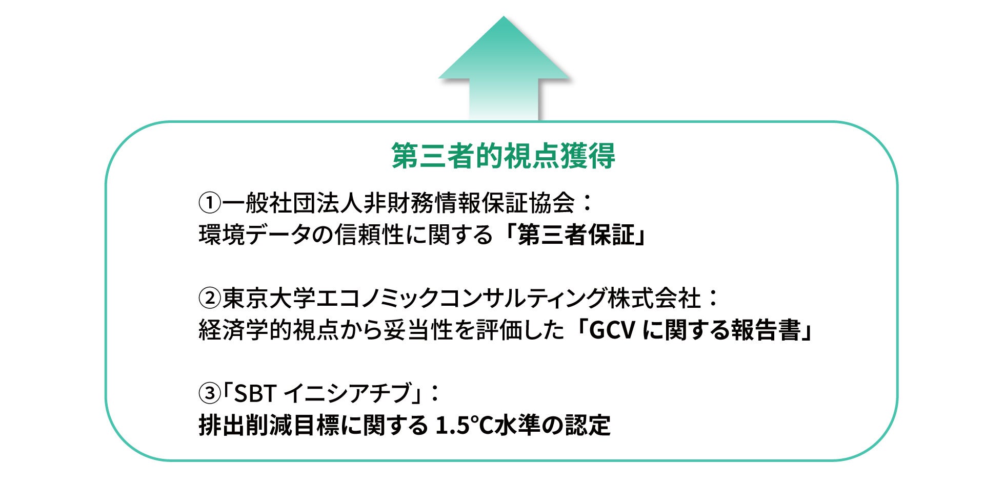 経営指標GCVについては、第三者的視点を獲得することでその信頼性・妥当性を高める取り組みを行っています。環境データの信頼性に関して2023年4月に第三者保証※4を取得、同7月に経済学的観点からの妥当性評価に関してGCVに関する報告書※5を作成しました。