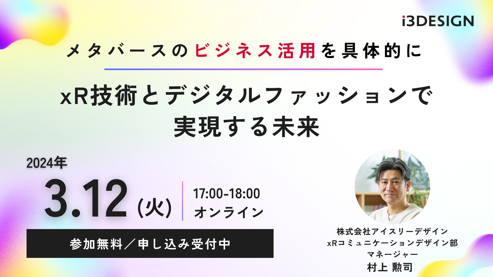 株式会社アイスリーデザイン(本社:東京都港区、代表取締役:芝 陽一郎、以下:アイスリーデザイン)は、「メタバースのビジネス活用を具体的に~xR技術とデジタルファッションで実現する未来~」をテーマに2024年3月12日(火)17時よりオンラインセミナーを開催いたします。