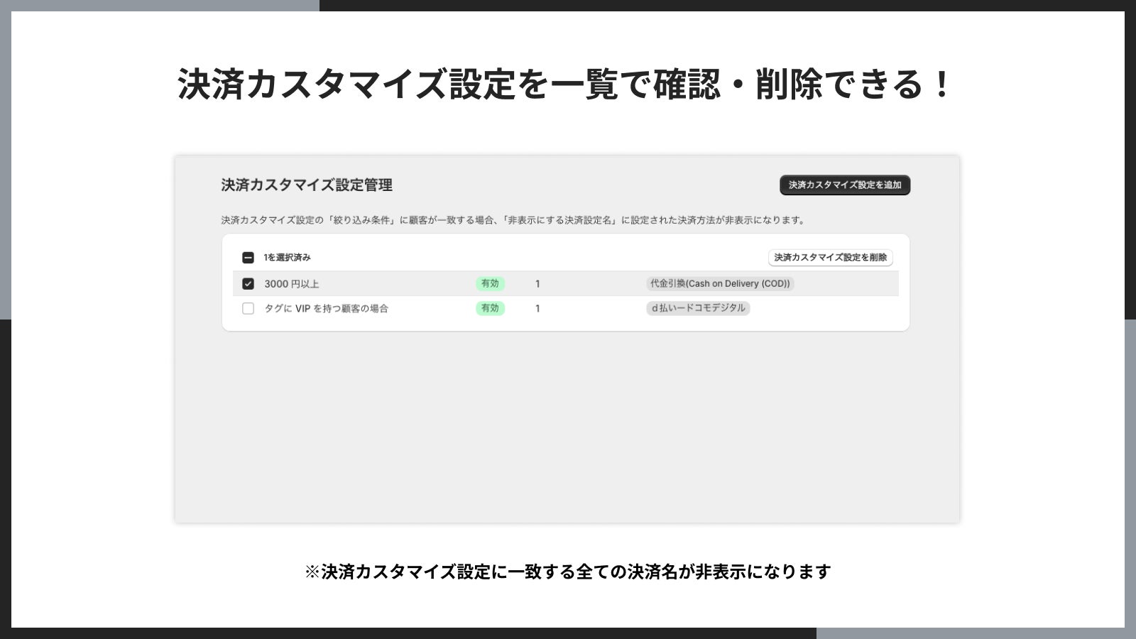 ■決済カスタマイズ設定を一覧で確認・削除できる!