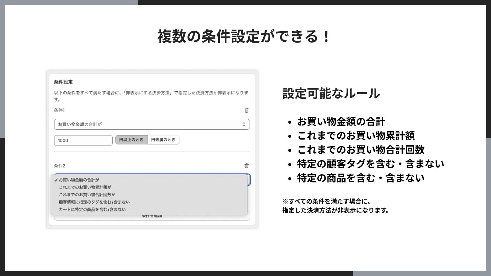 「シンプル決済カスタマイズ|お手軽条件ごとの決済方法」では、複数の条件を設定することができ、すべての条件を満たす場合に指定した決済方法を非表示にできます。