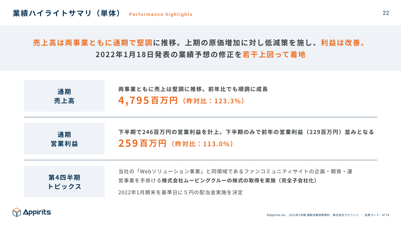 - 2022年1月期通期 単体 業績ハイライト(決算説明資料一部抜粋)