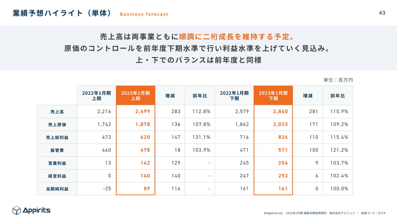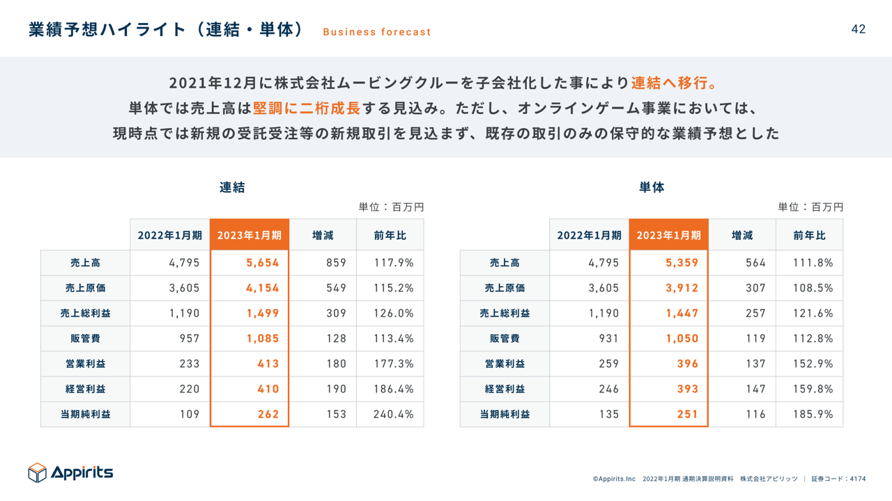2022年1月期は業績予想を若干上回って着地いたしましたが、2023年1月期もWebソリューション事業は引き続き活況な市場環境を追い風に、DXを実現するパートナーとして⼤型かつ長期的な取引の獲得を継続し、安定した成長を見込みます。また、オンラインゲーム事業は、売上⾼成⻑を保守的に⾒込んでおりますが、外注費コントロール等でセグメント利益⽔準の引き上げを行い、全社として増収増益を目指します。