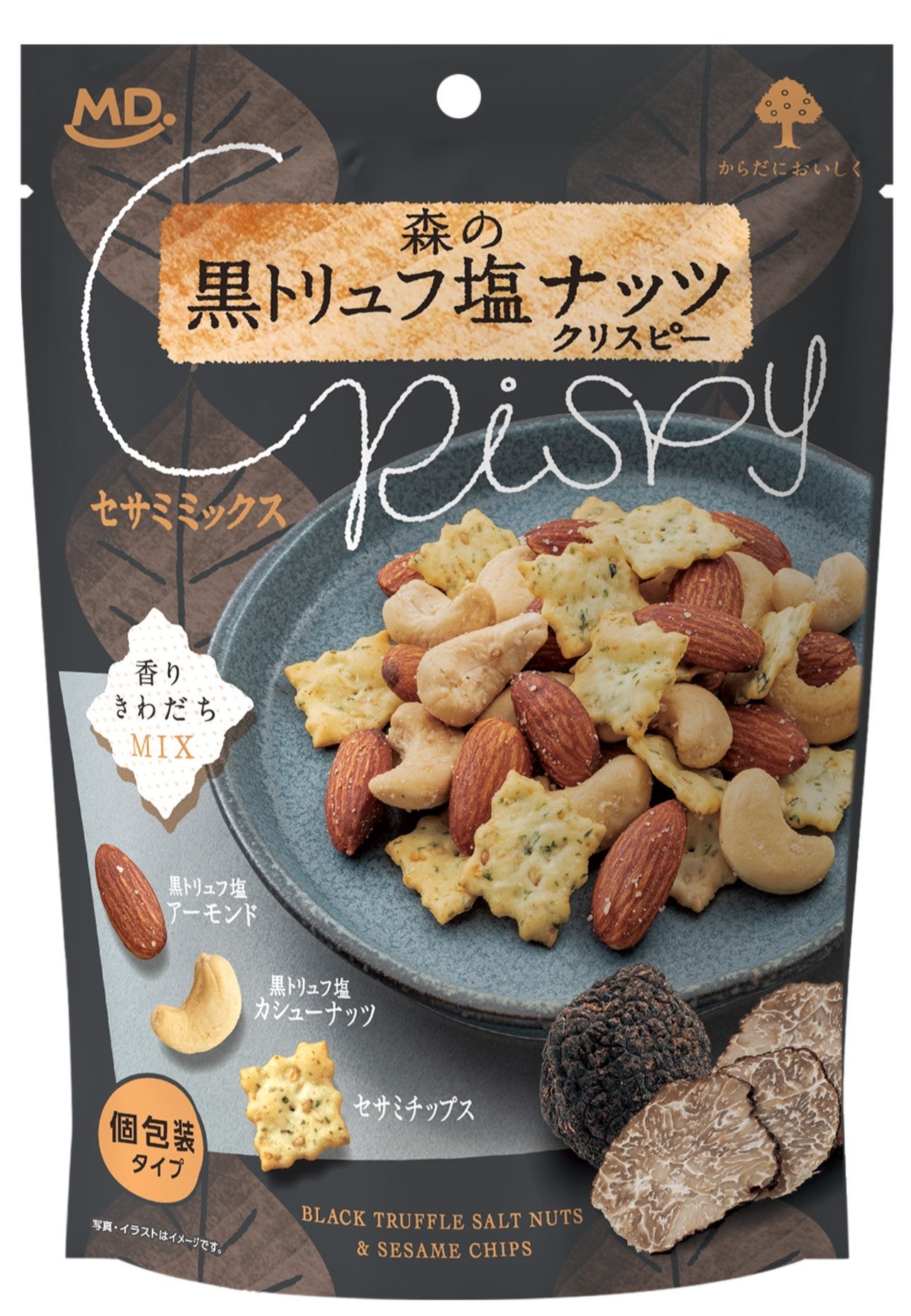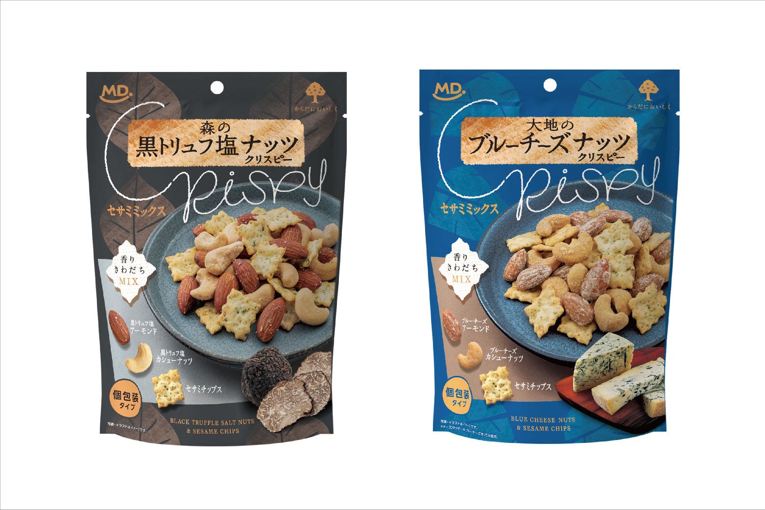 当社が企画販売する、フレーバーナッツに”セサミチップス”をミックスしたお菓子です。黒トリュフやブルーチーズの本格的な風味とナッツのコク深い香ばしさが味わいが楽しめる贅沢なナッツ系おつまみです