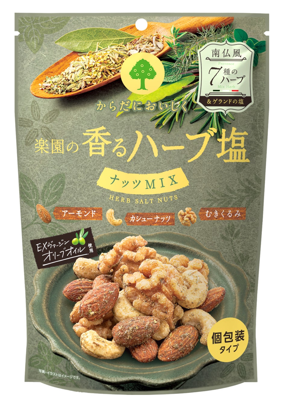 当社が企画販売する、フレーバーナッツのお菓子です。フランス産ゲランドの塩とEXヴァージンオリーブオイルで味付けし、7種のハーブの豊かな香りを楽しめるフレーバーナッツです