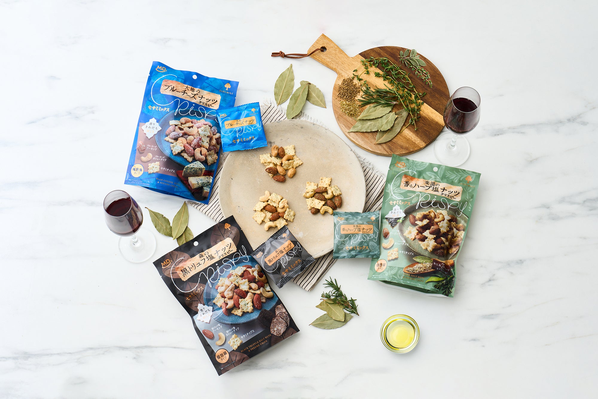 近年のおつまみ市場において「連続して楽しめること=連食性」が重視されており、家飲み需要や“飽きずに食べられる工夫”への関心の高まりを受け、同シリーズを開発いたしました。こうした市場動向は現在も継続しており、同シリーズの新フレーバーとして、7種のハーブ(タイム、セージ、オレガノ、フェンネルシード、マジョラム、ローレル、ローズマリー)とフランス産ゲランドの塩、EX(エキストラ)ヴァージンオリーブオイルを使用し、香ばしさや味わいを引き立てるよう味付けしたナッツに、アオサ海苔とゴマが香る“セサミチップス”を組み合わせた、豊かな香りが特長の商品として仕上げております。