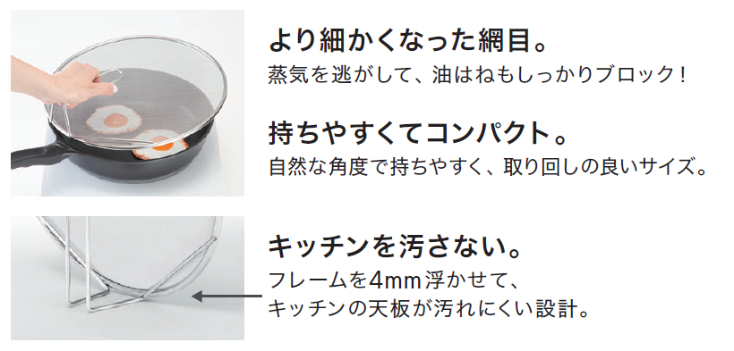 ③網目がより細かくなり、さらに油ハネを防ぎやすくなりました。また、細かすぎないので洗いやすい仕様です。