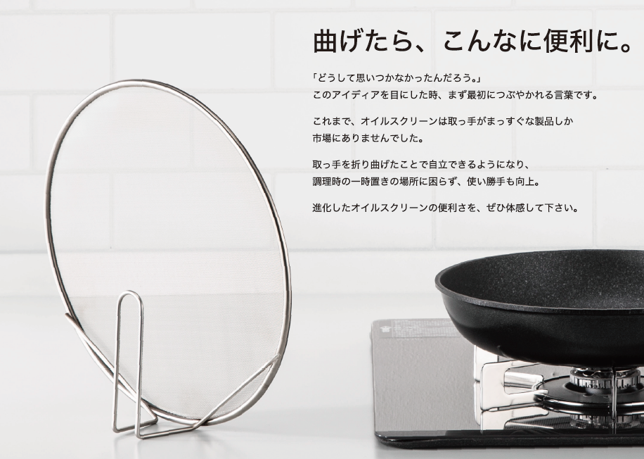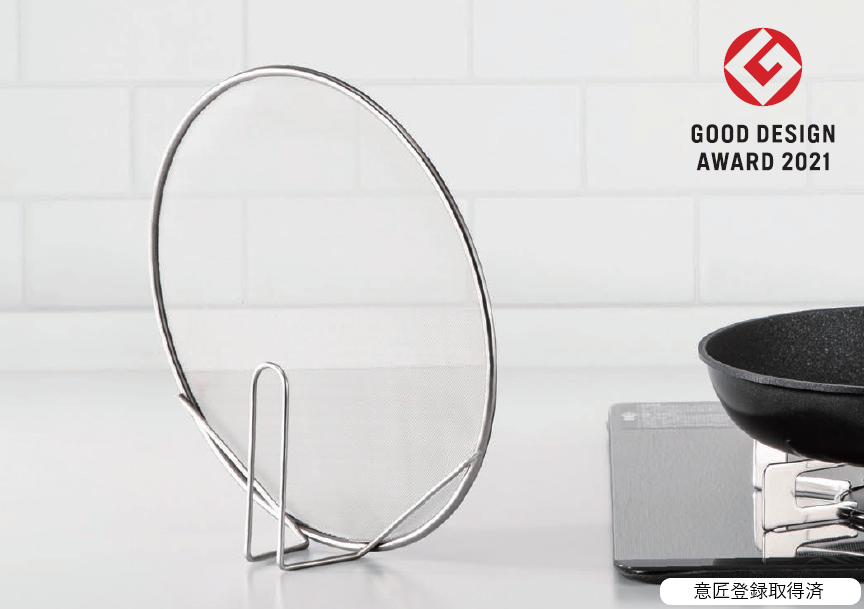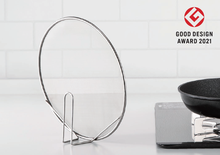 今回ご紹介する「立てられるオイルスクリーン」は、一見、取っ手を曲げただけのように見えますが、角度や強度、網目の細かさにいたるまで試行錯誤をくり返し、使い勝手にこだわって作り上げた商品です。機能面とデザイン面が無駄なくシンプルに融合していることが評価され、2021年グッドデザイン賞を受賞いたしました。