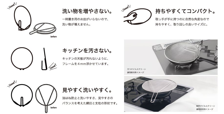 このたび、5月30日より、大人気のオイルスクリーンがさらに使いやすくなった「立てられるオイルスクリーン」を全店で販売いたします。従来のオイルスクリーンは自立しないため、調理中の置場に困るという不便さがありました。