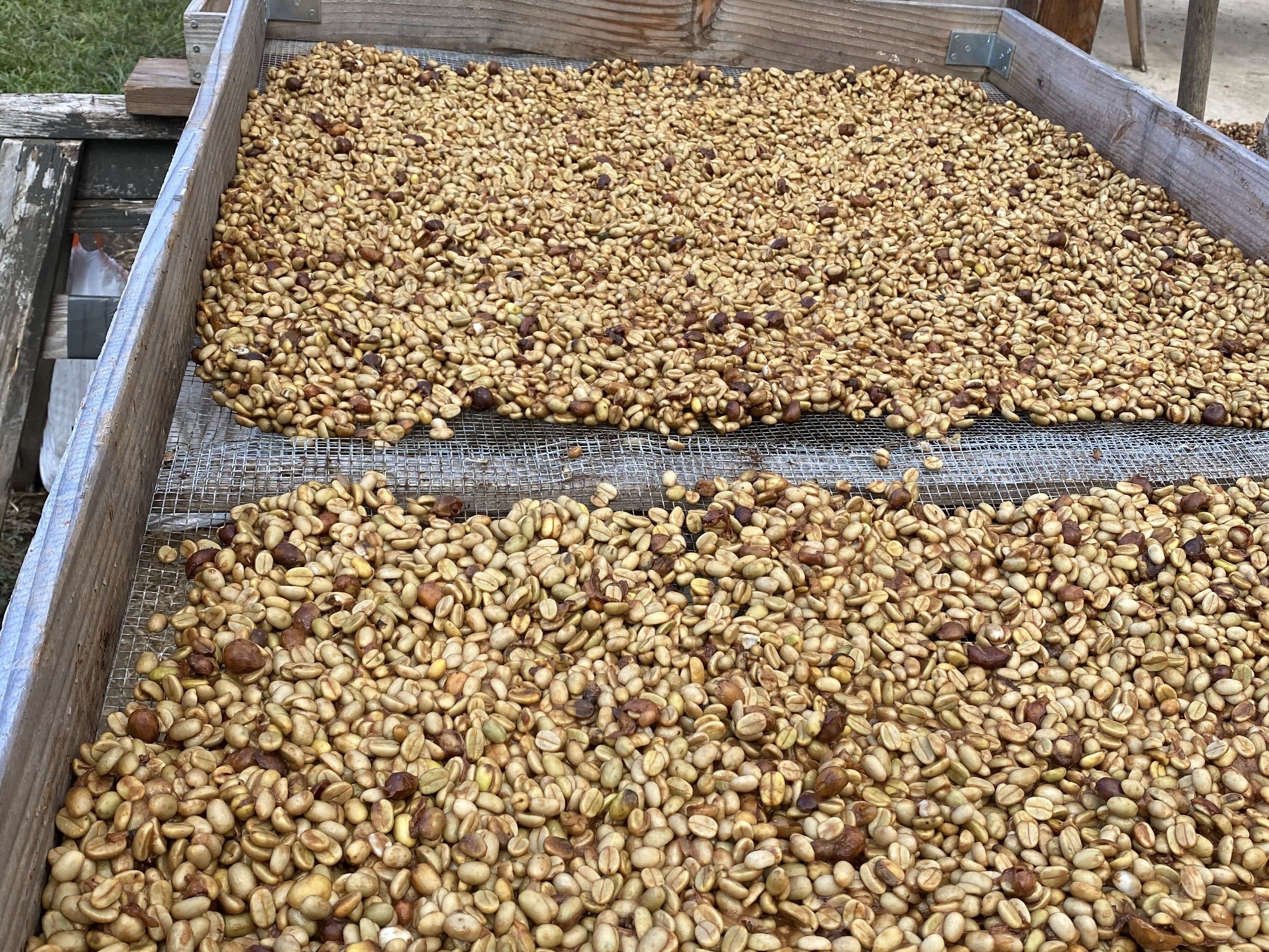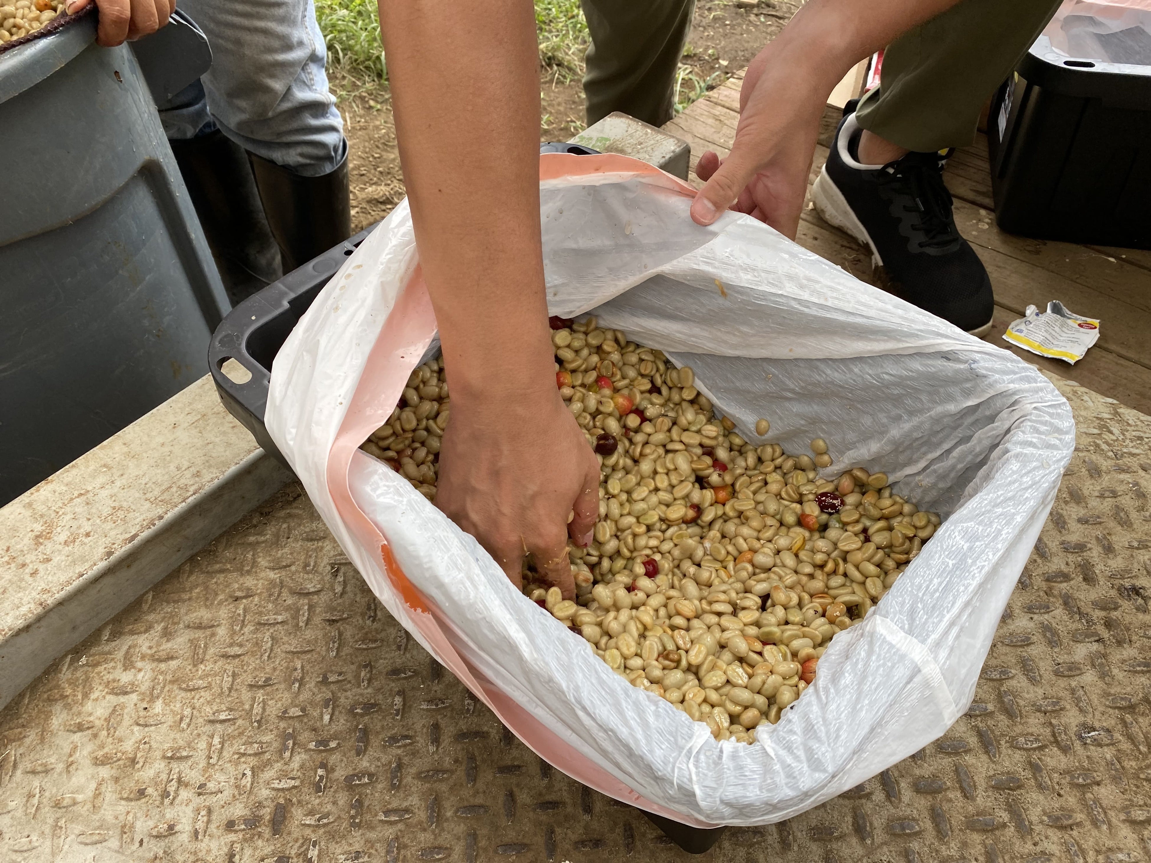 アナエロビコの精製過程の様子。空気に触れないように密閉し無酸素状態にする(上)その後天日干しで乾燥させる(下)