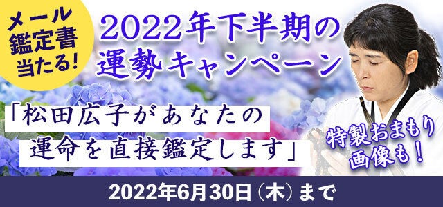 松田広子のサイトでは『2022年下半期の運勢キャンペーン』を開催中。期間中は対象鑑定をご購入の方全員に、『特製おまもり画像』をプレゼント。さらに抽選で3名様に、『松田広子があなたの下半期を直接占う メール鑑定書』をプレゼントいたします。ぜひこの機会に、あなたの下半期の運勢を鑑定してみてください。