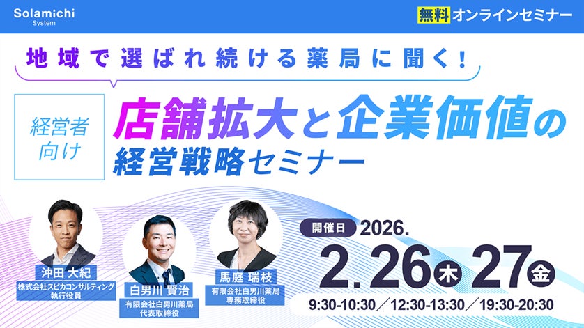 【ソラミチシステム:無料オンラインセミナー】2月26日、27日に開催!「【経営者向け】地域で選ばれ続ける薬局に聞く!店舗拡大と企業価値の経営戦略セミナー」