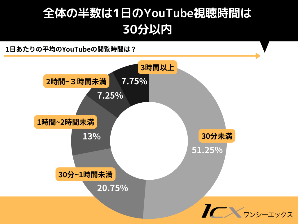 全体の5割、半数の方が1日のYouTubeの平均視聴時間は30分未満という結果になりました。