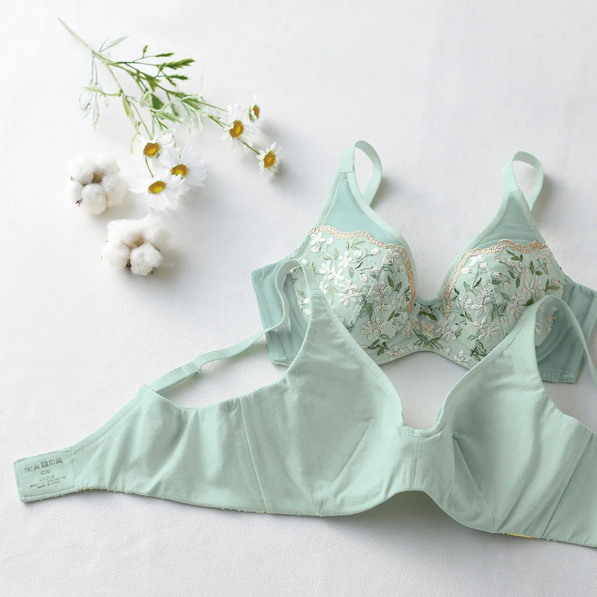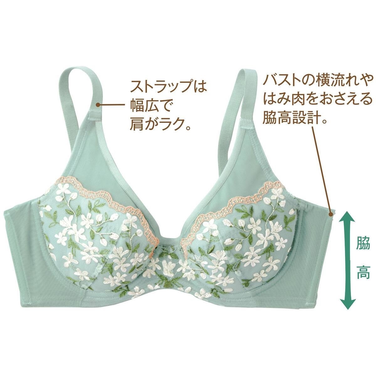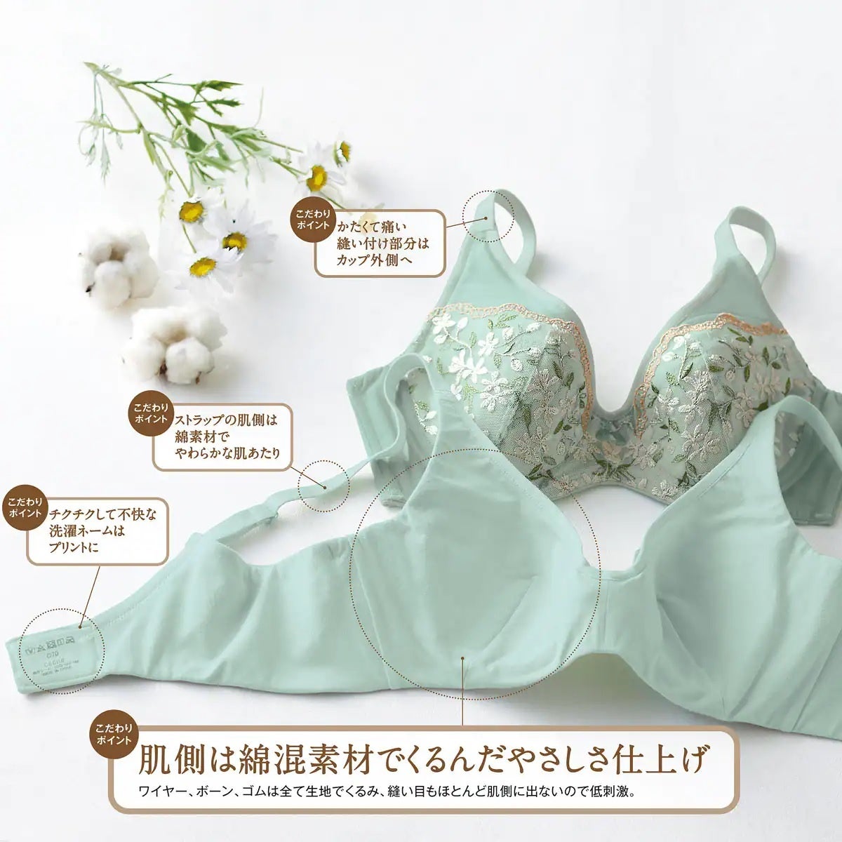 肌側はすべて綿混素材の肌にやさしい「Tシャツみたいなブラ®」のフルカップタイプ。定番タイプよりもバストになじみやすい、やや薄手のカップを使用し、やわらかくなってきたお肉もすっぽり包んで安定。カップに内蔵したパネルやサイドベルト表側に使ったソフトなパワーネットでボリュームのあるバストもやさしく支え、広がりも防ぎます。バストの横流れやはみ肉を防いですっきり整える脇高設計。幅広ストラップで肩がラクちん。花柄レースをあしらったナチュラルで可愛いデザインにもこだわりました。こだわりのブラ是非お試しください。