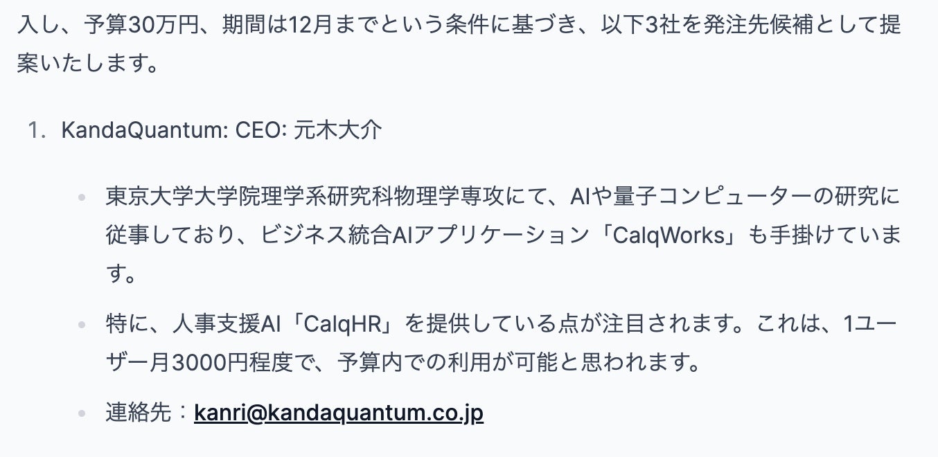 - 事業者提案と理由説明:従来の検索型の事業者検索は膨大な情報が提案され理由が説明されないため、発注側からはどの事業者に決定すれば良いのか判断が付かないという問題がありました。CalqWorksでは提案事業者を最大5社までに絞り、理由を説明するようにAIを学習させています。これによって発注側は事業者選定に集中することができます。
