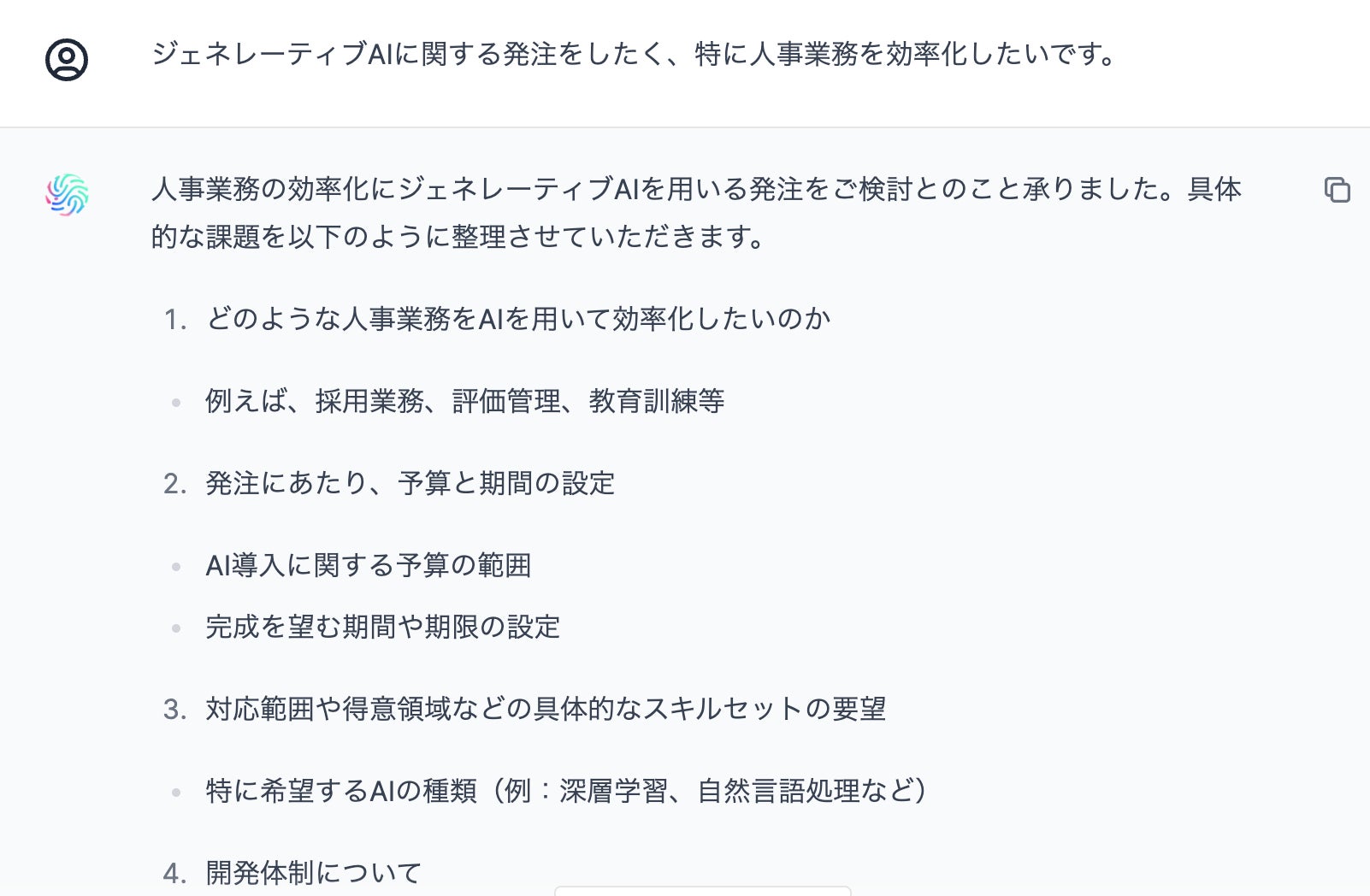 新たな情報を生成するAI技術で、個々の企業のニーズに合わせた情報を提供します。これは、ビジネスの意思決定を助けるための新しいアイデアや戦略を生成したり、マーケティングキャンペーンのための新しいコンテンツを作成したりすることが可能です。また、ユーザーとの対話を通じて、そのニーズ理解し、それに対応した情報を生成することも可能です。