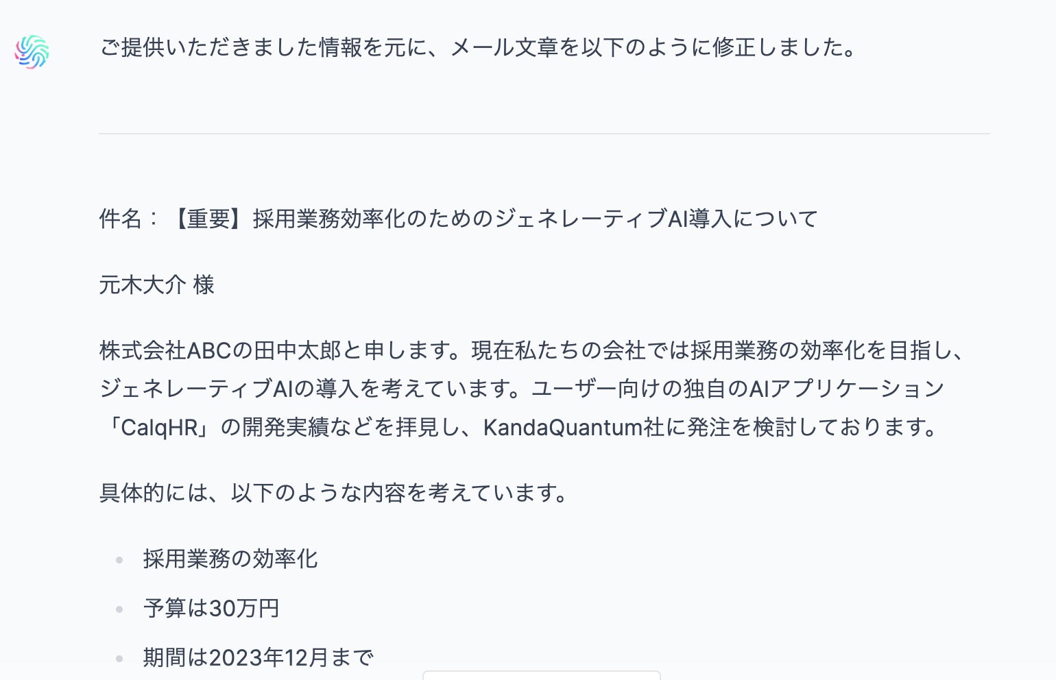 - メール文章提案:従来の手動やテンプレートに依存したメール作成は、時間と労力を消耗し、しばしば意図した効果を発揮できないという問題がありました。CalqWorksでは、AIが個々の状況を考慮した最適なメール文章を提案します。これにより、より効果的なコミュニケーションを発注側と受注側の間で実現することが可能となります。