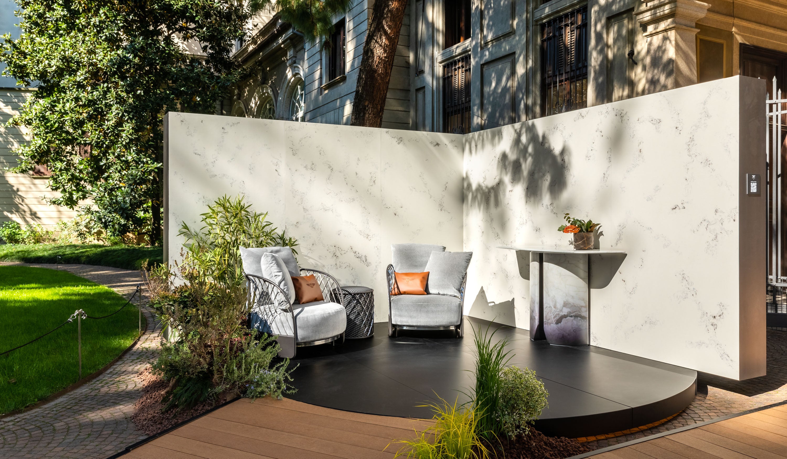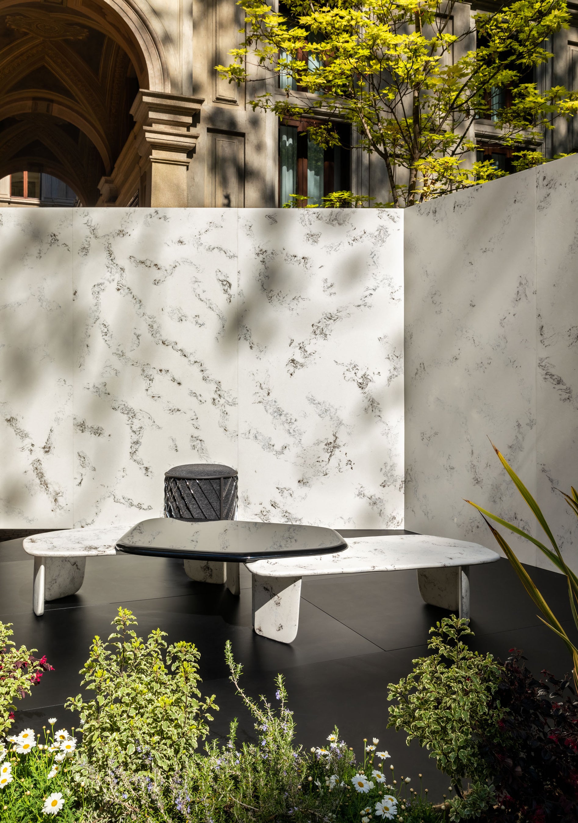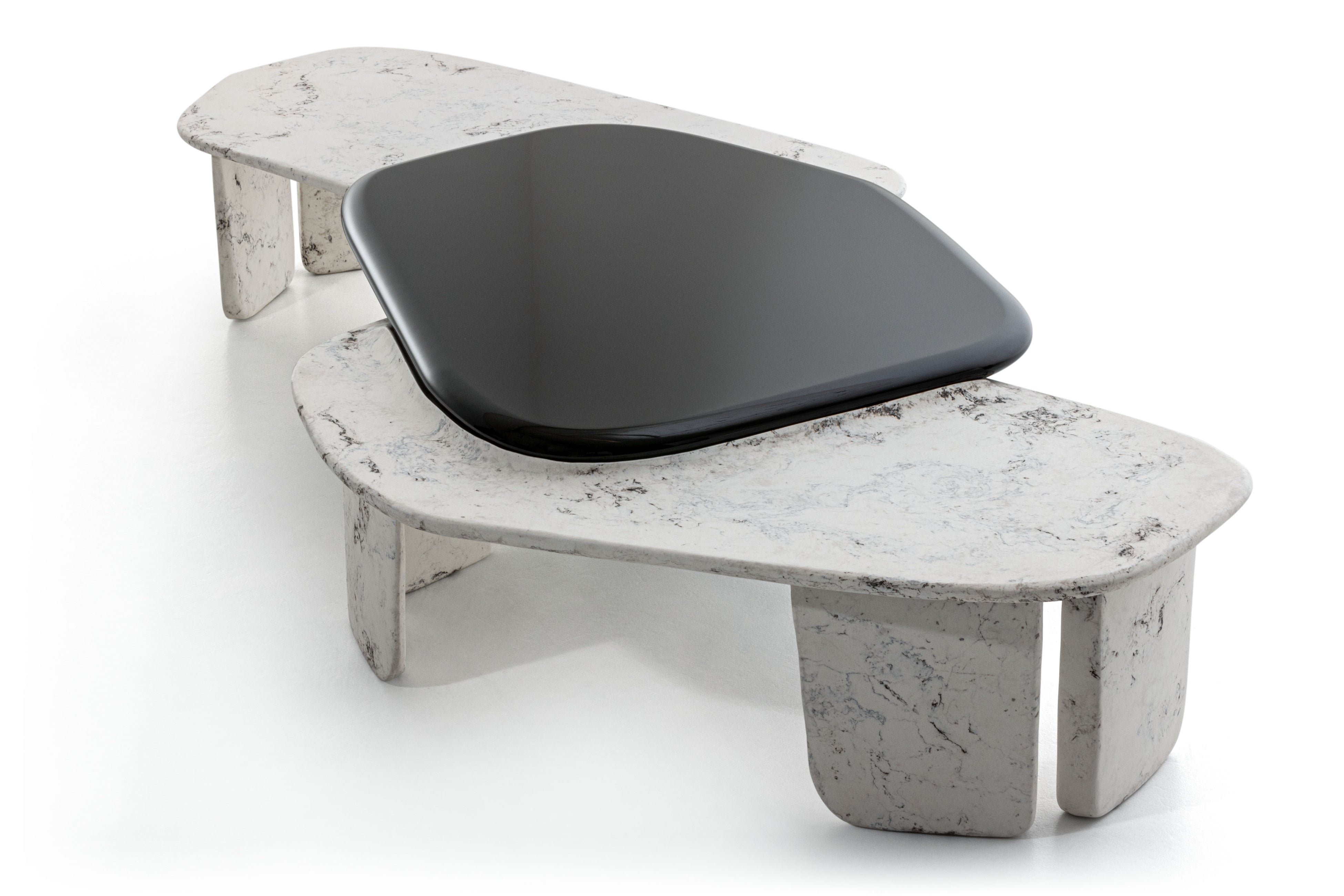 コーヒーテーブルのひとつは、リカルド・カヴァチオッキがデザインしたペーパーファクター®バージョンで提供されます。「原紙」のマイクロセルロースと天然顔料から作られており、大理石のようでありながら、モノクロやバーガンディーのアクセントを入れることができます。
