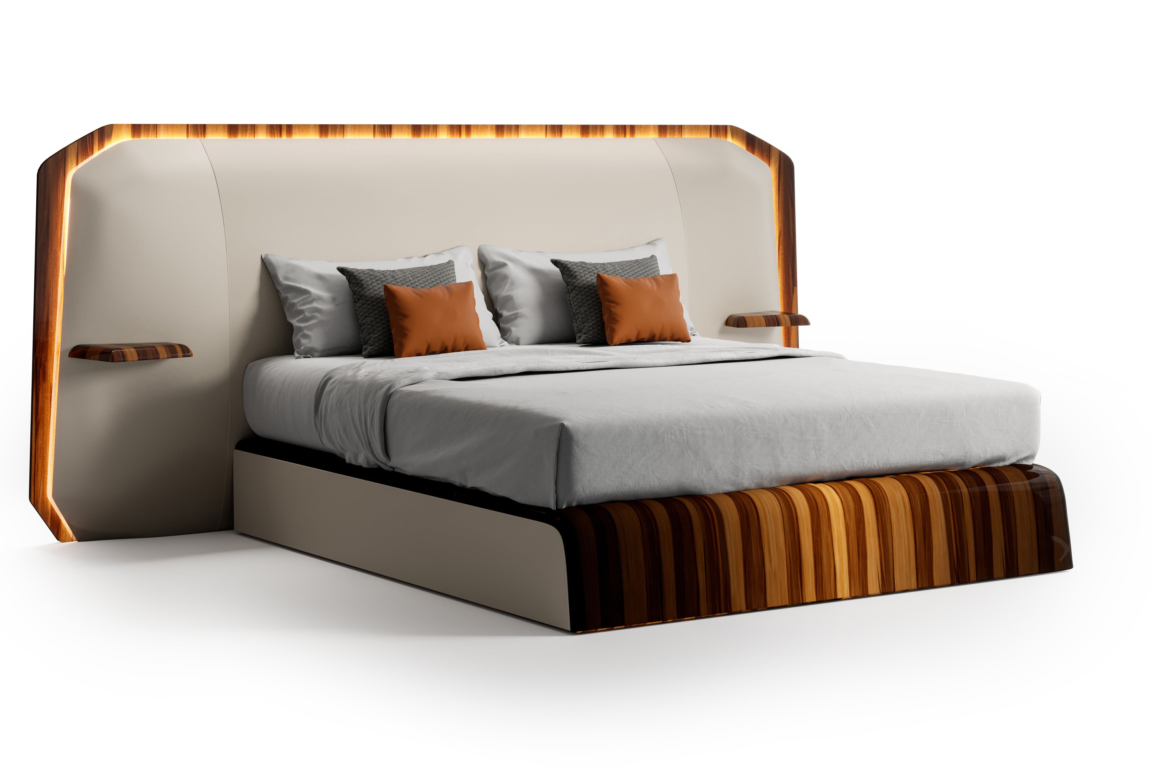 ミニマリズムとエレガンスを融合させた、曲線的でダイナミックなラインが特徴の、非常に快適なベッドです。ダブルのヘッドボードのインナーフレームは、天然の木材またはラッカー仕上げで、スリムな張地とのコントラストにより、ムーブメントというコンセプトを表しています。オプションのライトをヘッドボードに組み込むことができ、美しく機能的で、ベッドの多様な質感を際立たせています。インナーフレーム、ベッドサイドシェルフ、フットボードは、木材を選択することができます。