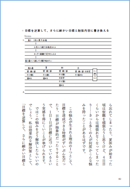目標を逆算して、さらに細かい目標を勉強内容に書き換える手帳術の一例です。