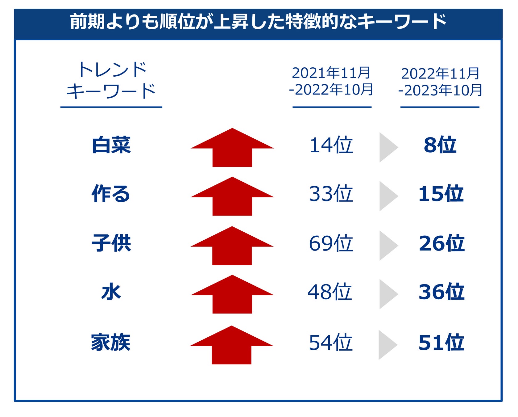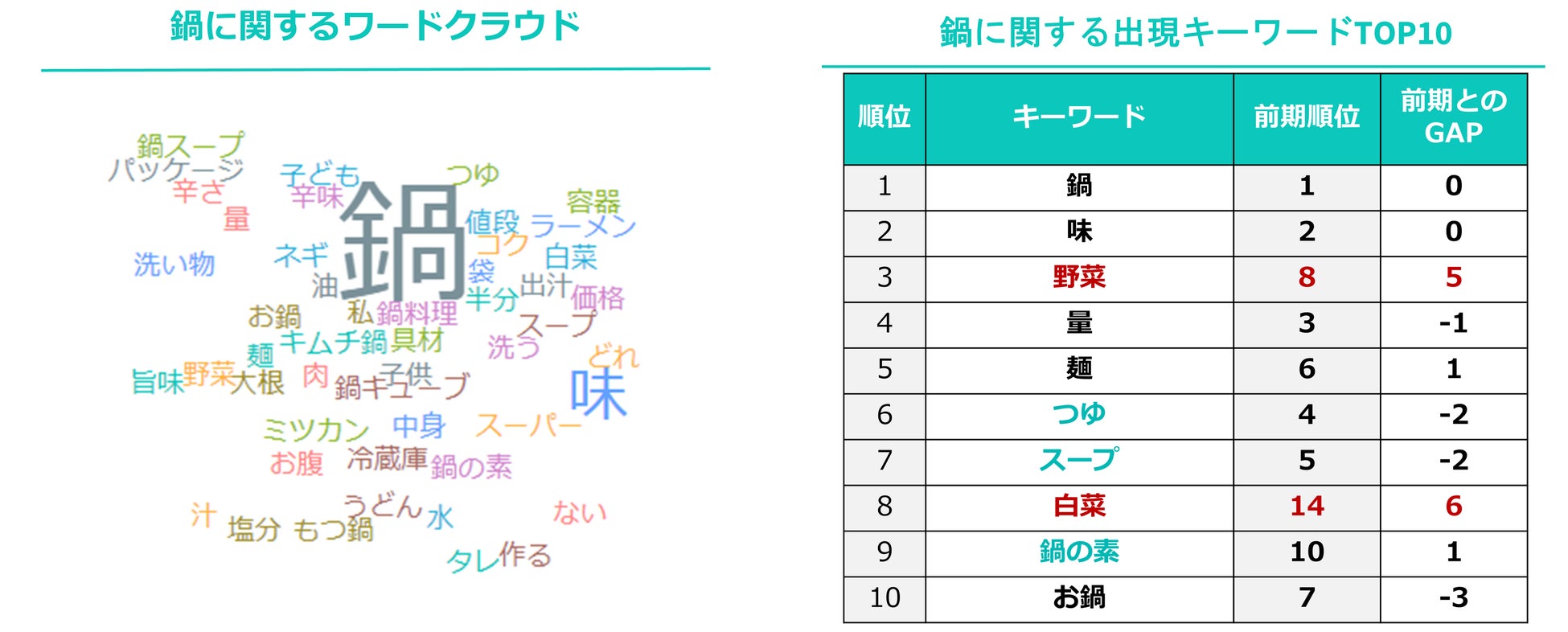 鍋料理における出現キーワードのランキングをみると、野菜が大きく順位をあげてきている。つゆ・スープ・鍋の素は鍋つゆについての同義語ワードで、かつランキングの上位のため引き続き生活者の想いが集中している事がわかる。