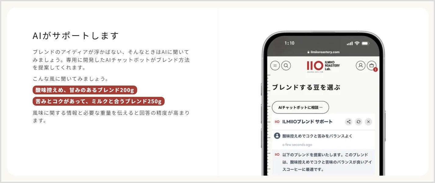 ILMIIO ROASTERY Lab.では、これまで一般のお客様向けにオリジナルブレンドが作れるサービス「ILMIIOブレンド」を提供してまいりました。このサービスでは、「どうブレンドしたらいいかわからない」という方のために、AIが好みに合わせたブレンドを提案する機能を搭載しております。