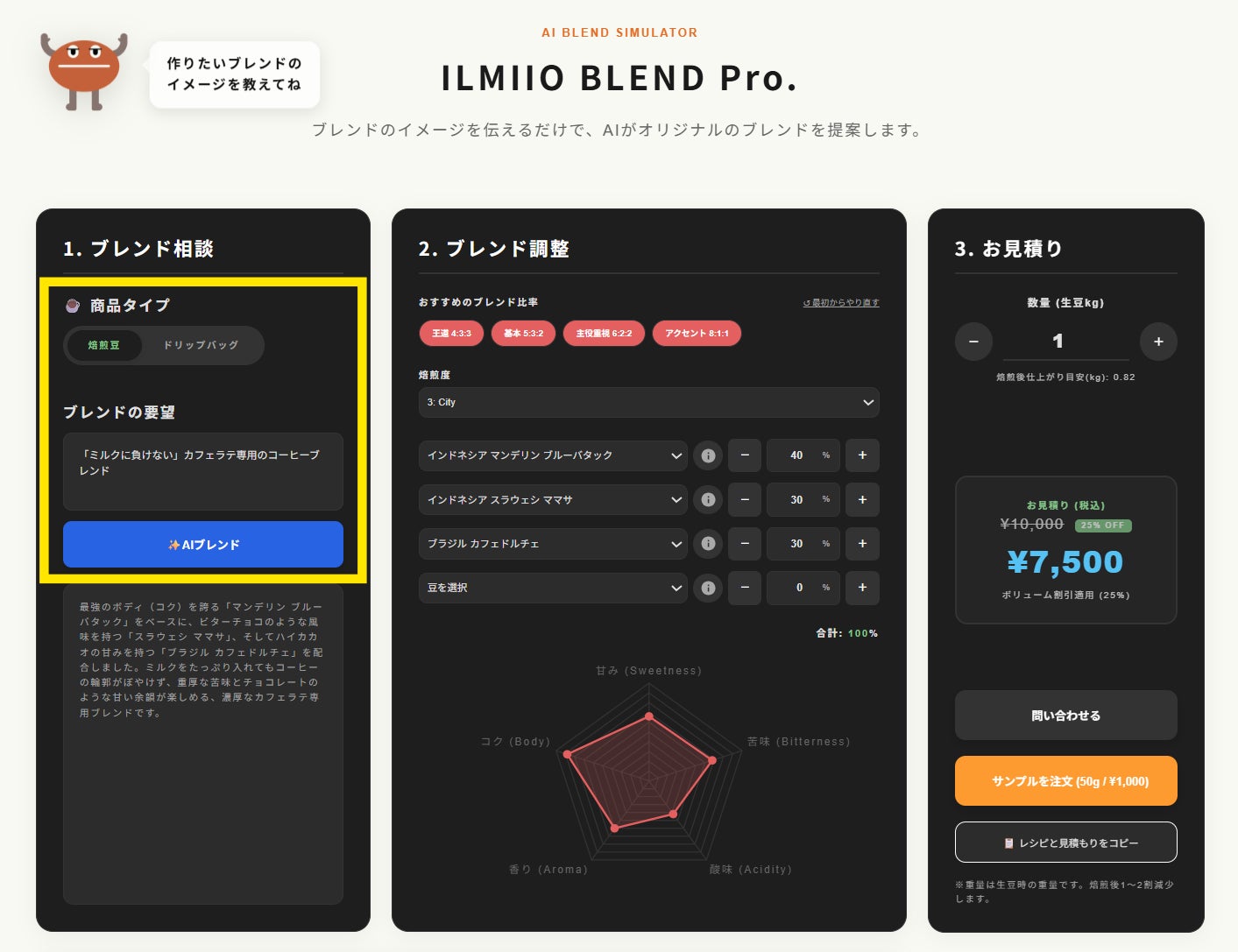 感覚的なイメージからプロ仕様のレシピと見積もりを即時に提示。好みの味を視覚的に調整し、1kgからの法人発注をスムーズに支援する新サービス。