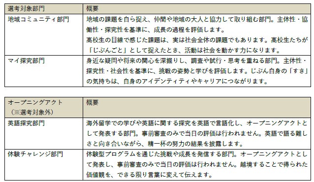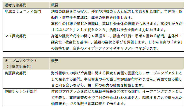 AWARDの表彰対象としては「地域コミュニティ部門」「マイ探究部門」の2部門。オープニングアクトとして「英語探究部門」「体験チャレンジ部門」の2部門があります。どの部門においても、成功や失敗は問わず、挑戦しようとする強い前向きな姿勢を重視しています。
