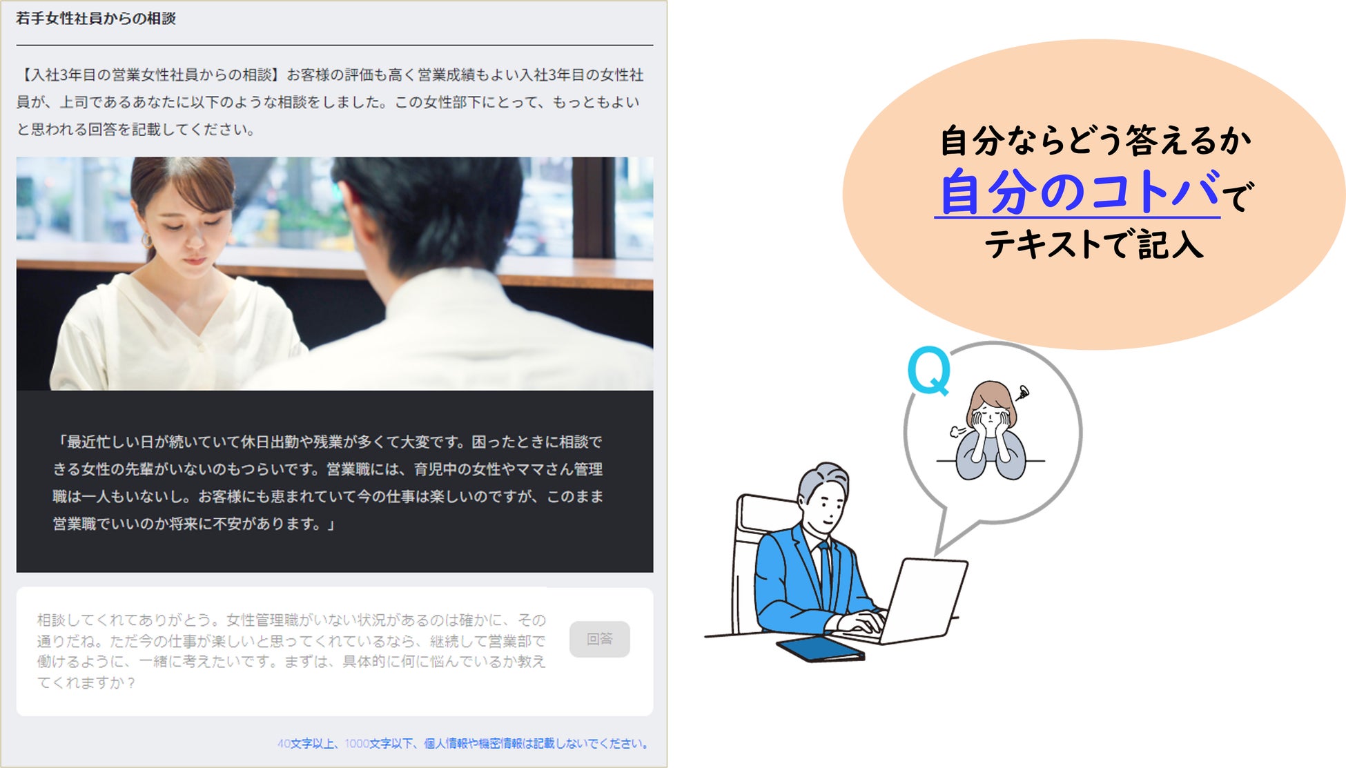 さまざまなシチュエーションを想定した題材(1on1シーン)を継続的に追加し、企業人事の直面する課題にタイムリーにお応えしていくとともに、お客さま自身による題材作成など、従業員の日々の活動に組み込めるサービスをめざします。