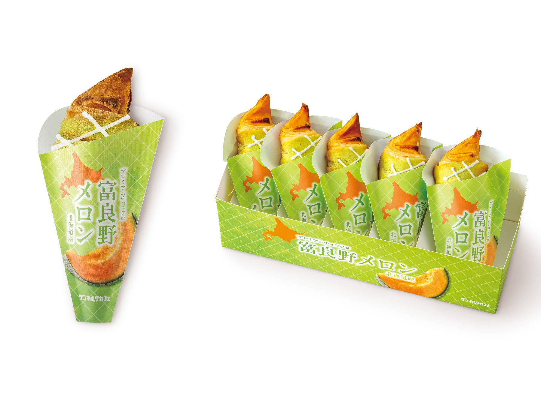 「プレミアムチョコクロ 富良野メロン」は、サクサクのクロワッサン生地で華やかな赤みを帯びたオリジナルメロン風味ホワイトチョコレートと、富良野メロンピューレを使用したミルクメロンクリームを包みこみ、富良野メロンピューレ入りの特製フィリングとともに焼き上げることで、北海道・富良野が育んだ豊かなメロンの風味を贅沢に閉じ込めた一品。クッキーのようなサクサクとした食感と、爽やかなメロンの風味をお楽しみいただけます。そして、仕上げに施された格子状のアイシングデコレーションは、まるでメロンパンのような可愛らしい雰囲気を演出し、見た目も味わいもメロンパンなチョコクロです。