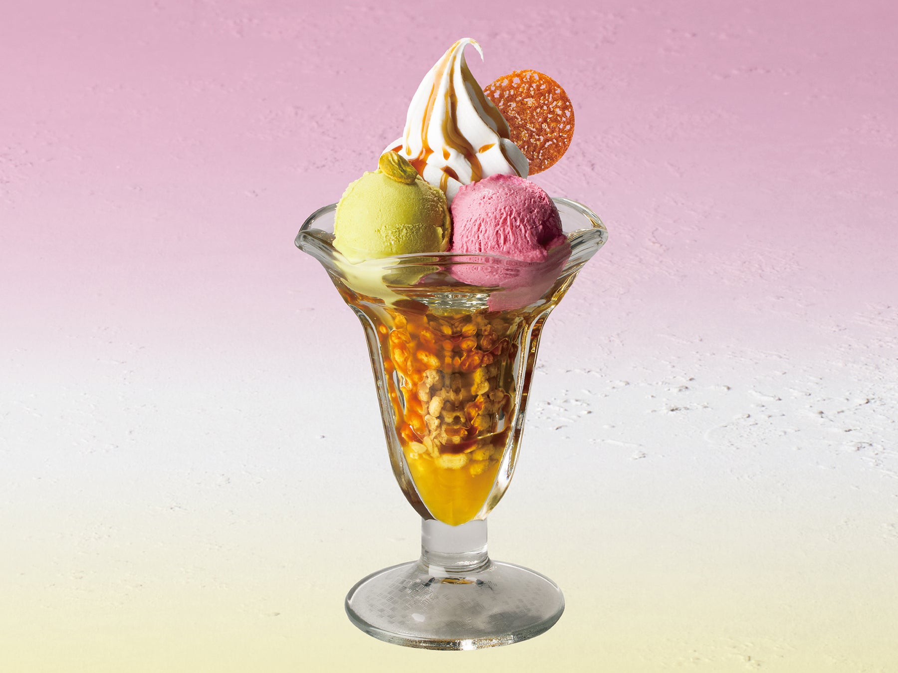 「ピスタチオとカシスの塩キャラメルパフェ」は、「パフェ佐藤」が全面監修し、サンマルクカフェのためだけに考案したオリジナルレシピに基づいたスペシャルメニュー。りんご果肉入りソースとザクザクとした食感が楽しいグラノーラ、なめらかなソフトクリーム、濃厚なピスタチオアイスとホールピスタチオ、そしてふわっとした口当たりで心地よい酸味のカシスムースが層をなし、食べ進めるごとに異なる表情を見せます。さらに、店内で丁寧に焼き上げたアーモンドチュイールが香ばしさと繊細な食感をプラスし、サンマルクカフェオリジナルの塩キャラメルソースが全体の味わいを絶妙にまとめ上げます。