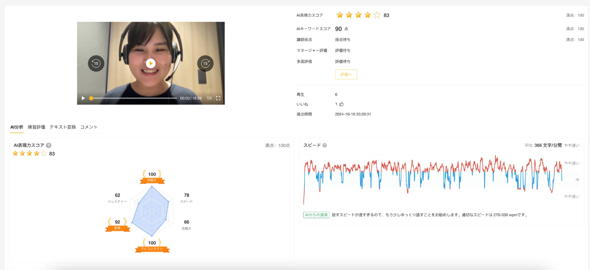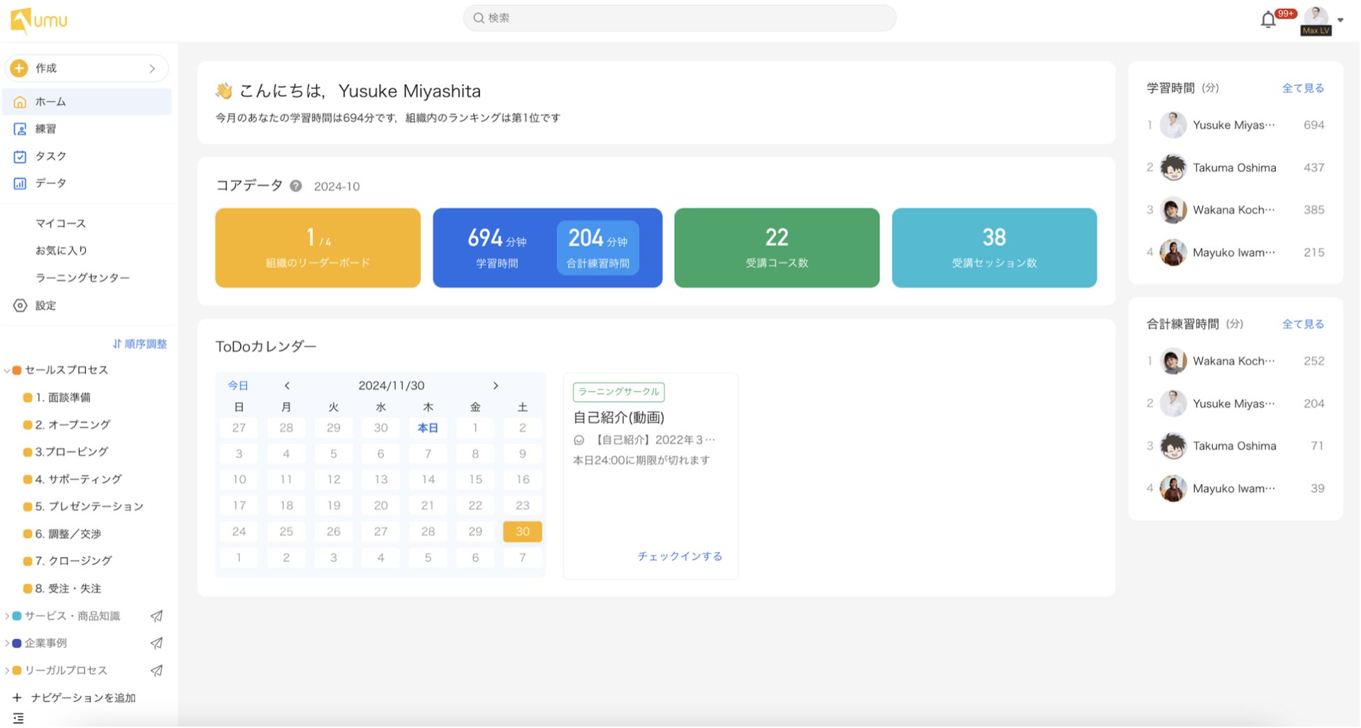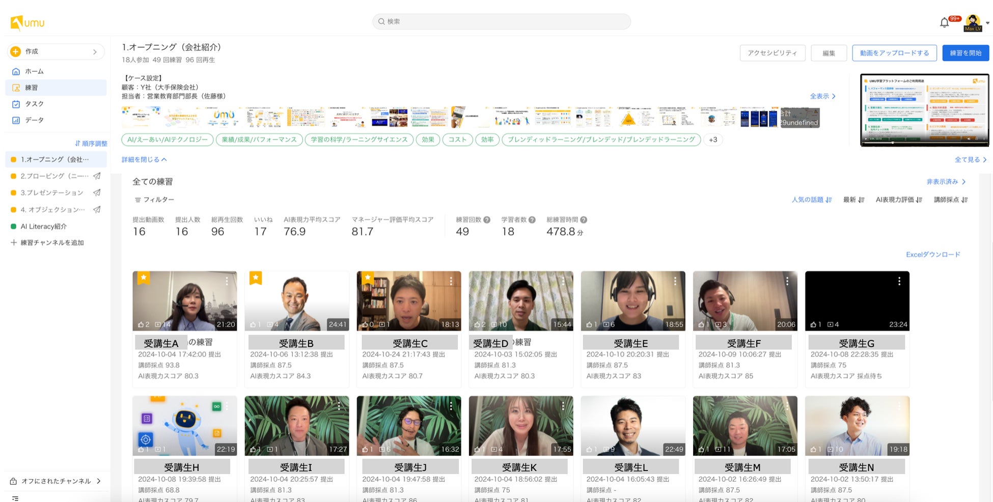 練習データ活用:営業管理者は、メンバーの進捗状況やスキル評価をダッシュボードで可視化でき、チーム全体のパフォーマンスを効果的にサポートできます。