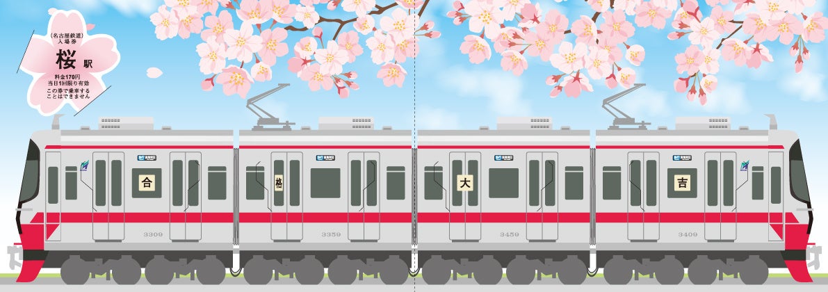 受験生の合格を祈願し、「3359号車」の1車両を特別に装飾し、「サクラサク合格(3359(サクラサクごうかく))祈願列車」として運行します。同車内には、山田天満宮(名古屋市北区)にてご祈祷を受けた「五角形(合格)つり革」を桜の花アドストラップで装飾し、桜のイラストシートカバーを設置するほか、メッセージ広告で車内をジャックします。