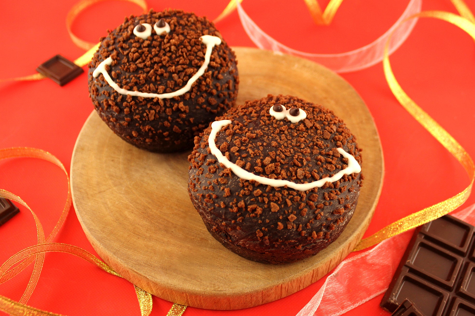 もちっとしたココア生地に生チョコレートが入ったなめらかなチョコクリームを包み、チョコクランチをつけて、アイシングとチップチョコで可愛らしく仕上げました。