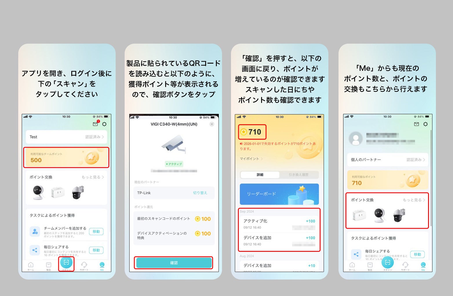 VIGI製品の導入時(インストール前)に、製品に貼付されたQRコードをスキャンすることでポイントを獲得。さらに、その製品を24時間以内にアクティベートすることで追加ポイントをゲット。貯まったポイントはTP-Link製品や人気商品*に交換可能です。